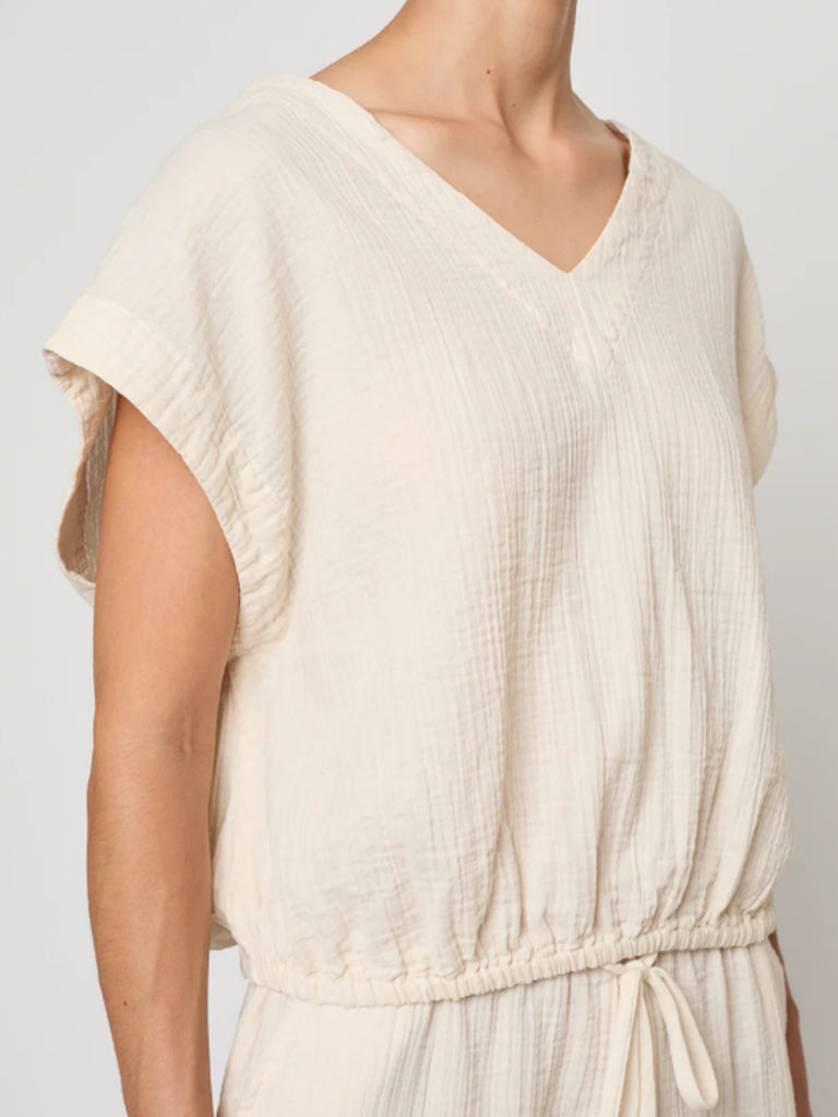 The V Neck Danielle Top is an effortless pull-on style crafted from Atelier Delphine’s lightweight signature crinkled organic gauze from Japan. Designed with cap sleeves that softly cover the shoulder and an elasticated waist that creates a flattering smocked silhouette, it balances comfort with subtle structure.