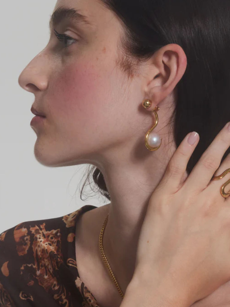 Crafted with an ear jacket design, these earrings are composed of 3 parts: A front-facing 8mm Ball stud, a swerving earring back suspending a gorgeous 12mm Blush Freshwater Pearl, and a bullet clutch for closure.