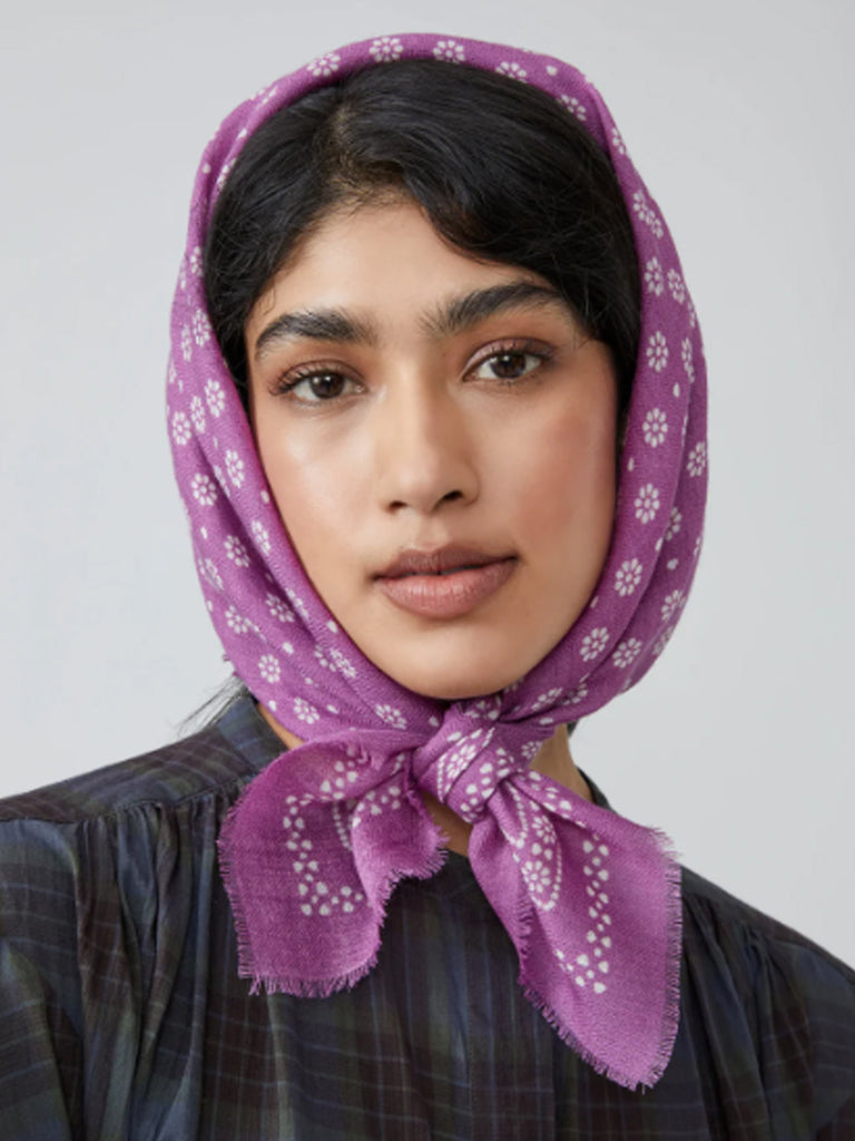 Inspired by the bandana, it features fringed edges and a square format of 70 x 70 cm, perfect for wearing around the neck or in the hair. Its graphic linear edges bring a modern and structured touch to this piece made from 100% wool.