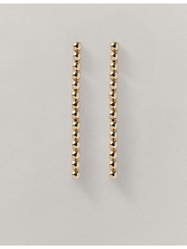 An addition to a timeless classic, the Tennis Drop earrings are an elegant adaptation of the classic tennis bracelet. Crafted with 14k gold plated hollowed sterling silver that falls freely below the earlobes.
