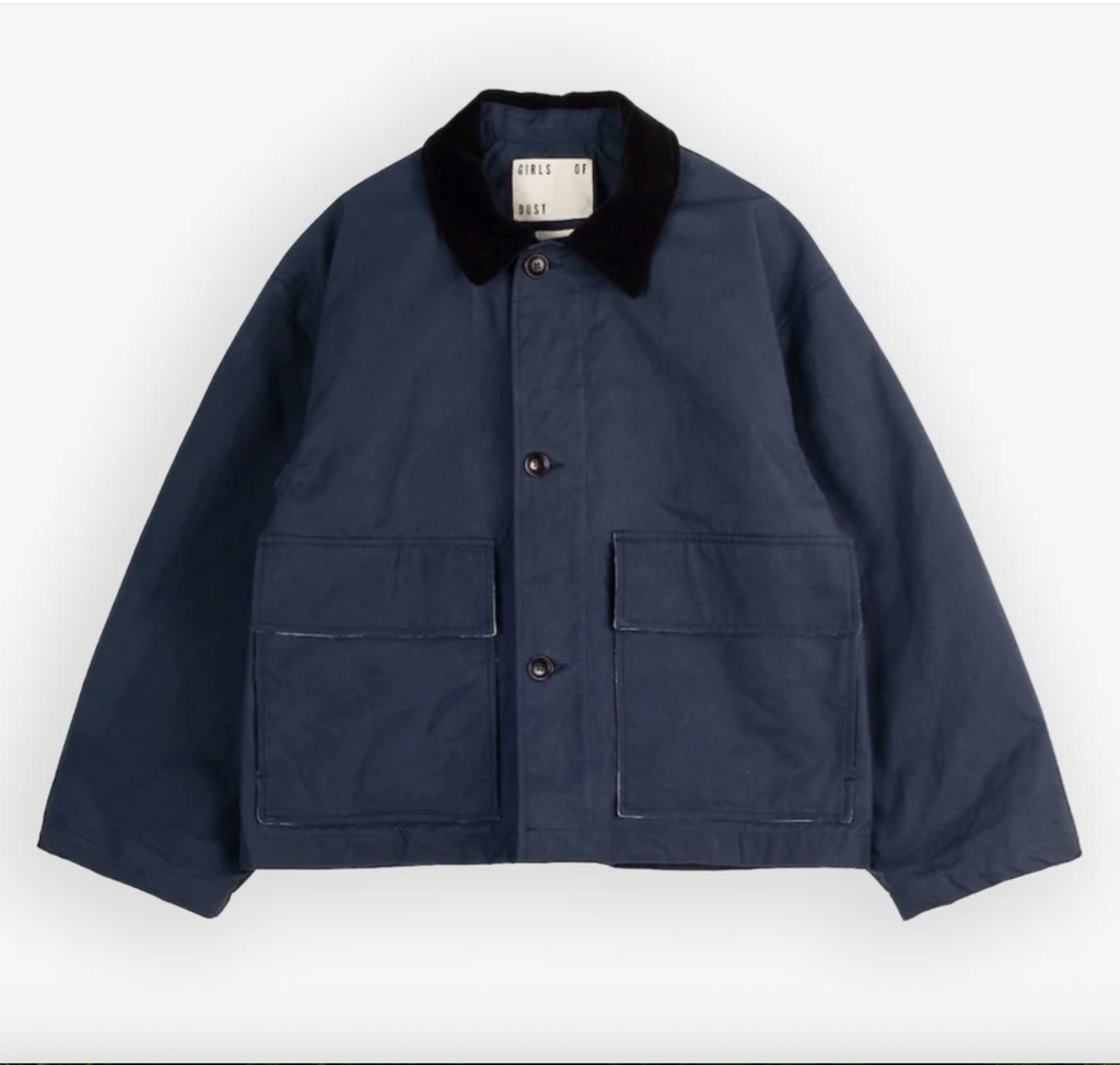 A modern classic reimagined. This cropped worker jacket is cut from dry waxed cotton with a subtle water-repellent finish. It features a 3-button closure, a contrasting corduroy collar, and two large front pockets with both top and side entry. Functional, timeless, and built to last.