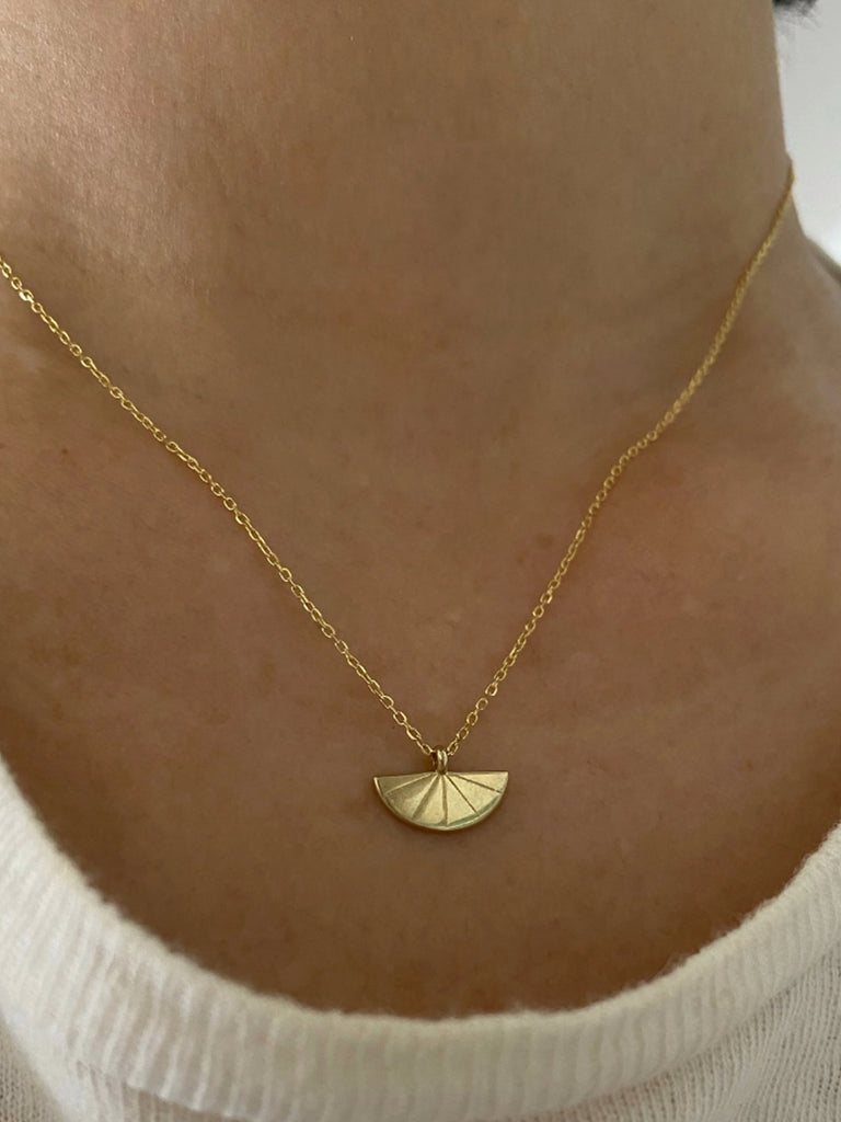 An architectural Art Deco inspired pendant hanging from a delicate chain. The facets catch the eye and we love how open to interpretation this pendant is. Some see a fan, others see an orange slice, anything goes.