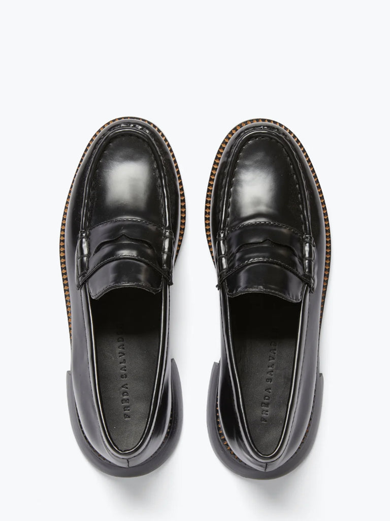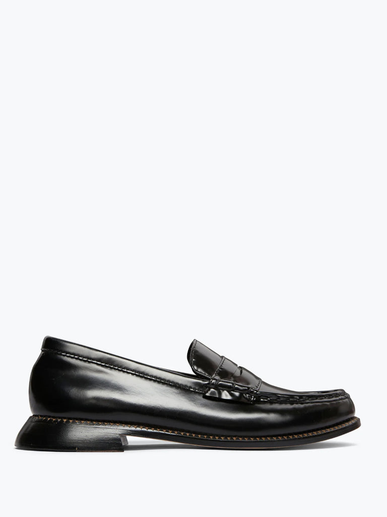 Our modern take on a classic penny loafer. Handcrafted in a bold black spazzolato, the ELBA updates the timeless style with our signature notched welt and angled leather heel. We’ll live in these loafers with everything from oversized suits, to cuffed jeans and socks to long skirts.