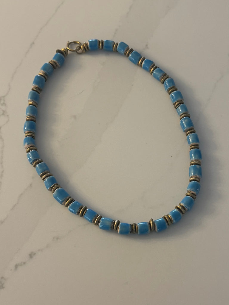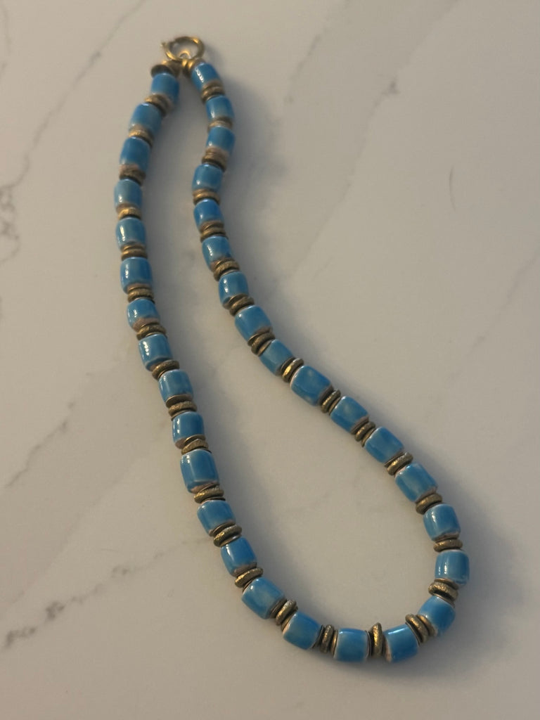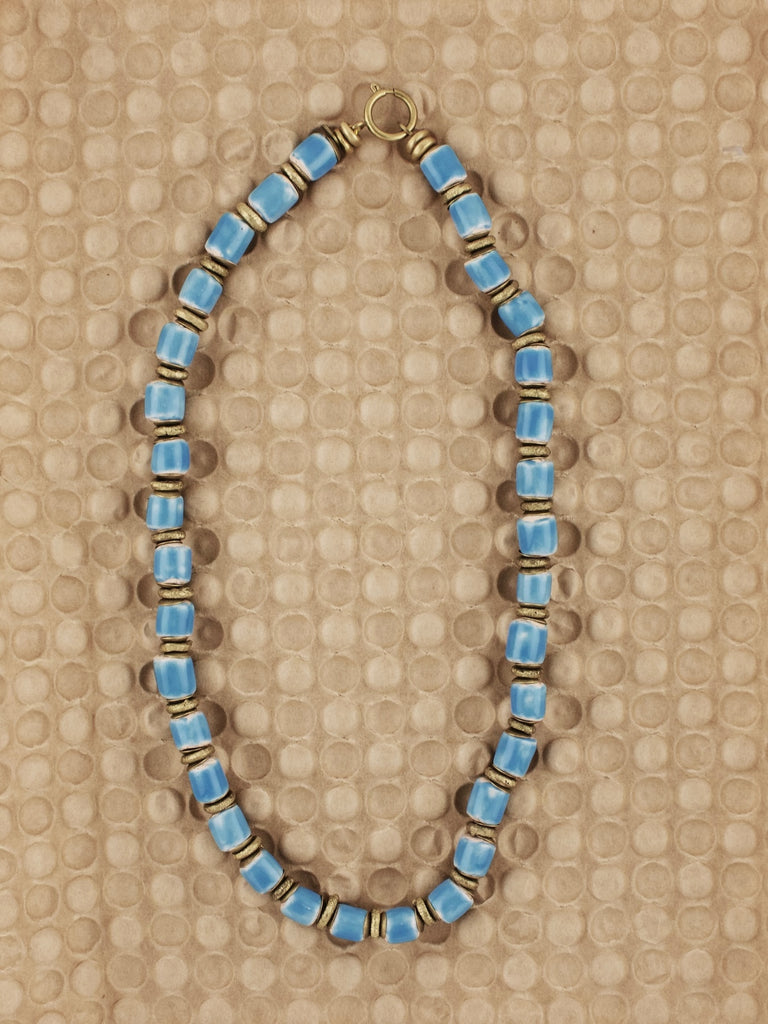 Handcrafted ceramic beads secured with a vintage brass clasp. Beads handmade by women in Ukraine. A weighty and sustainable necklace perfect for daily wear, suitable for breaking up layered chains. Hand strung in NYC.