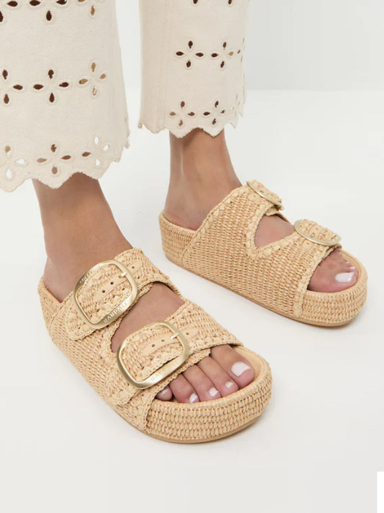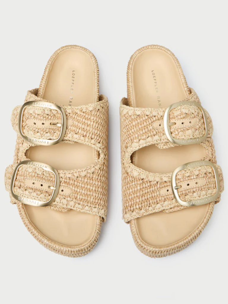 Two-band platform sandal in natural chunky woven cotton fabric with tonal whipstitch detailing. Features Loeffler Randall's signature big-buckle hardware, a padded leather footbed and an open toe. 1.5-inch platform.