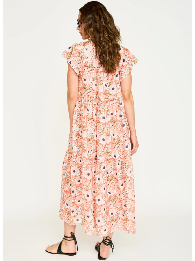 This stunning maxi dress features a ruched elastic neckline, hand block printed. Short raglan sleeves and side pockets add practicality, while a matching tie belt completes the look. Unlined for ultimate comfort and versatility.