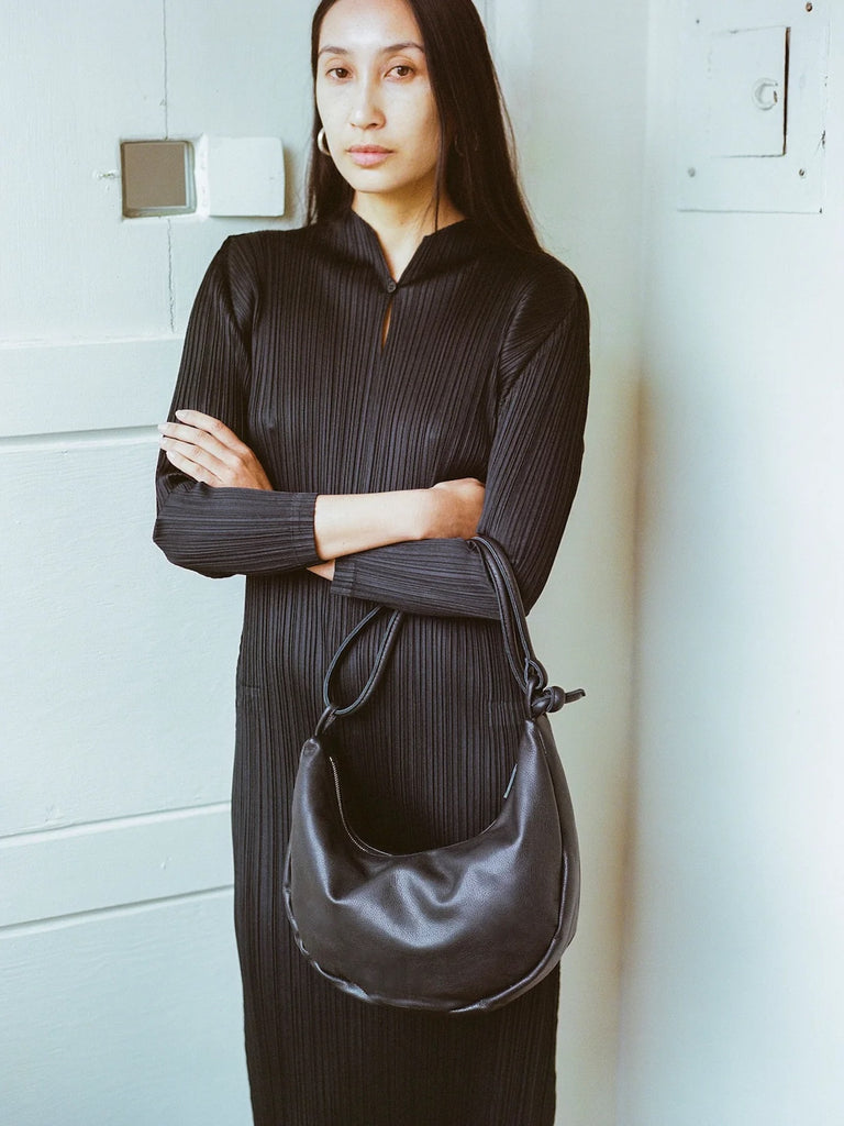 A larger version of Are Studio's best-selling style. The Large Bow bag is a soft form crescent shaped bag featuring one rolled strap with a knotted end for adjustability and a zipper closure. Unlined leather. Vegetable tanned semi-aniline cowhide.