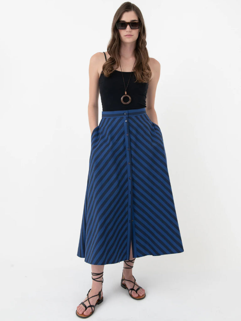 This graphic and flattering button-up skirt will be in your weekly rotation this spring and summer. Throw it on with a black tank and sandals or try the whole fun head-to-toe stripe look. The skirt has in-seam pockets and a functional button placket and sits at the natural waist.