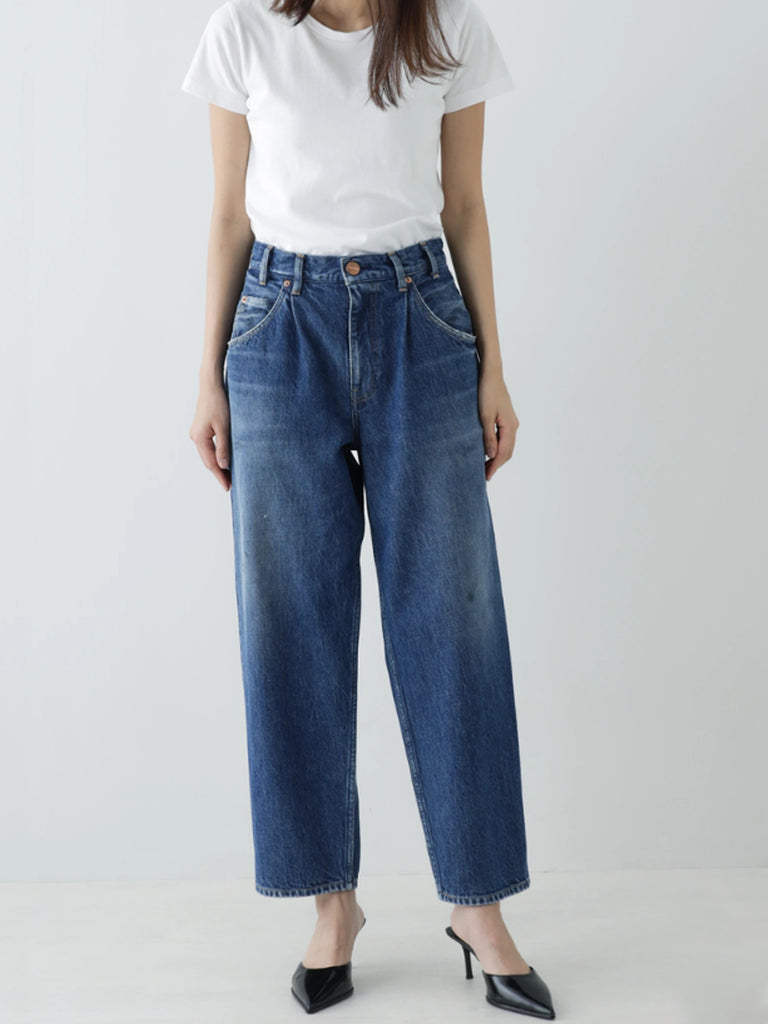 A casual one-tuck is added at the waist, with a tapered hem while the hip area has a loose silhouette. In addition, it is lightly paint-splattered to create a more vintage feel. The fabric is made of 100% cotton denim fabric, which is characterized by its unique bite, grain, and texture, and is made of return cotton (yarn collected and reused from unused cotton generated in the spinning process) for both the warp and weft.