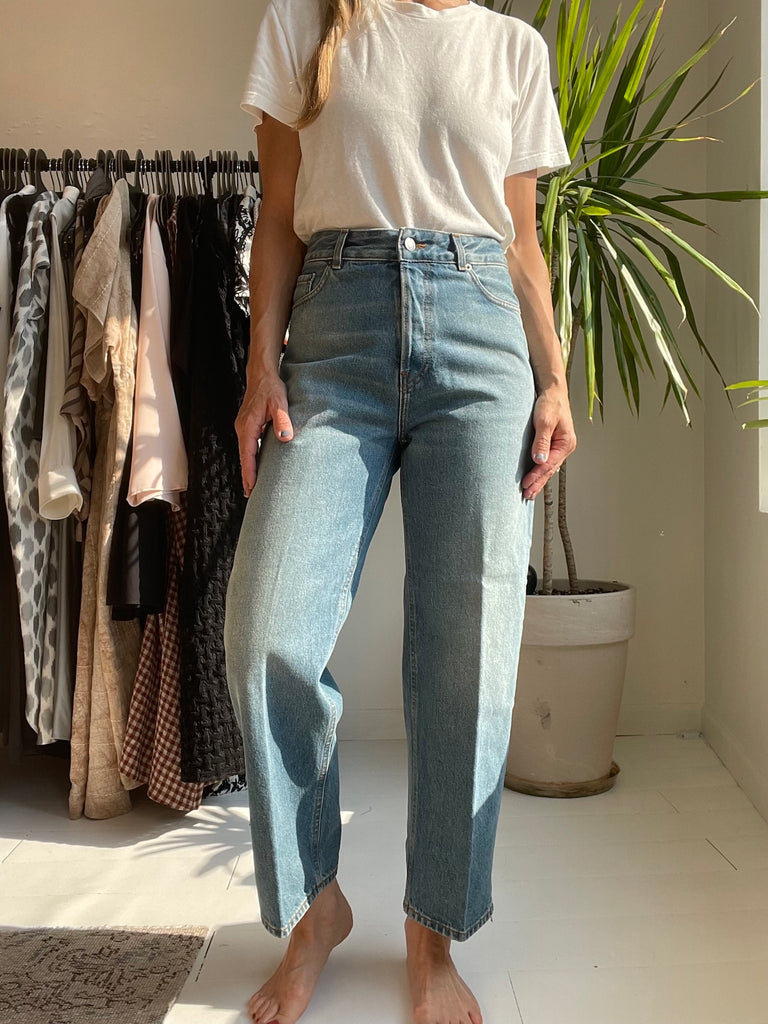 Relaxed fit wide-leg jean with a button front closure. Made from soft, non-stretch denim. 100% cotton. Made in Italy.