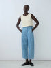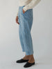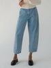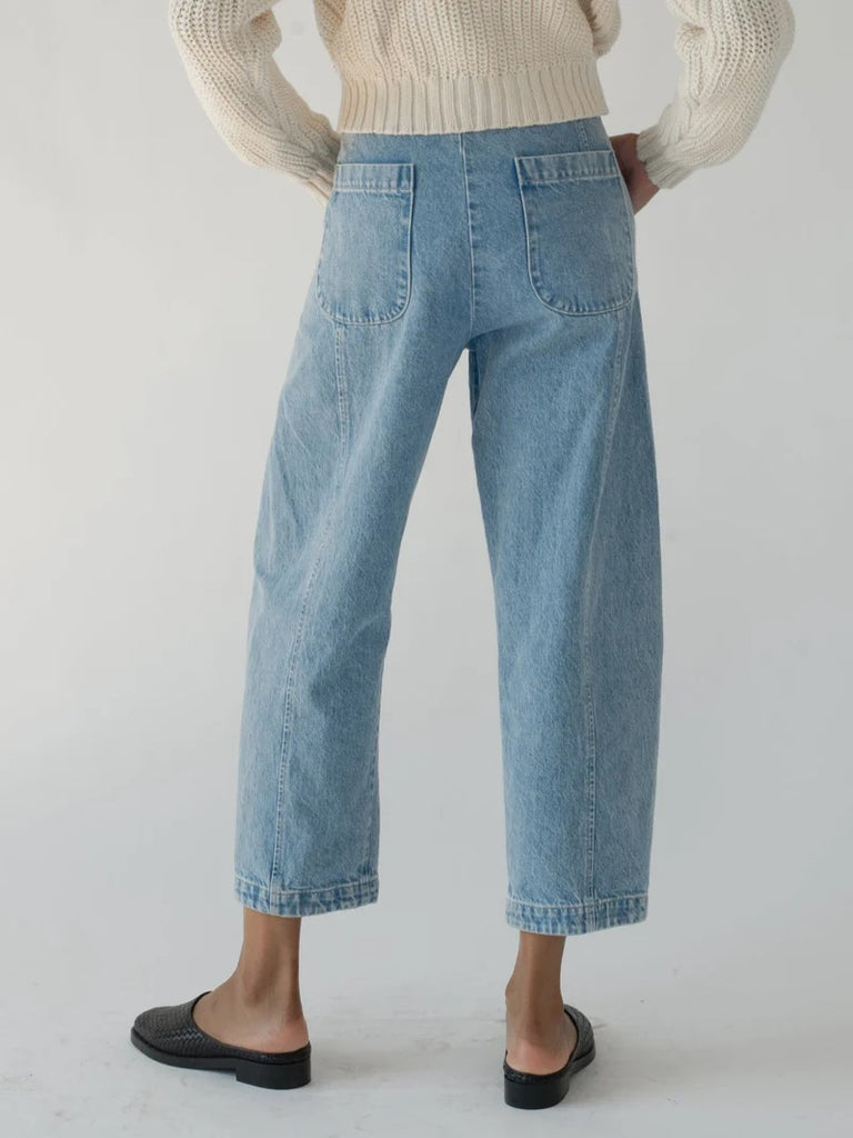 For an elevated everyday feel, the Lune Pant in Denim is our go to choice. Designed to accentuate the curve of the body with a seamless side seam that smooths the hip to waistline. This pant features no bulky waistband that creates a smooth and flattering feel in the waist with minimal bulk and extra comfort. The leg shape features a balloon style shape at the lower leg that balances the body and adds extra interest to any look. This pant has both front and back pockets. The Lune Pant is made in Italian Denim that undergoes a completely vegetal style wash at the Italian mill for finishing. Crafted with double single needle construction for durability and strength for season after season wear.