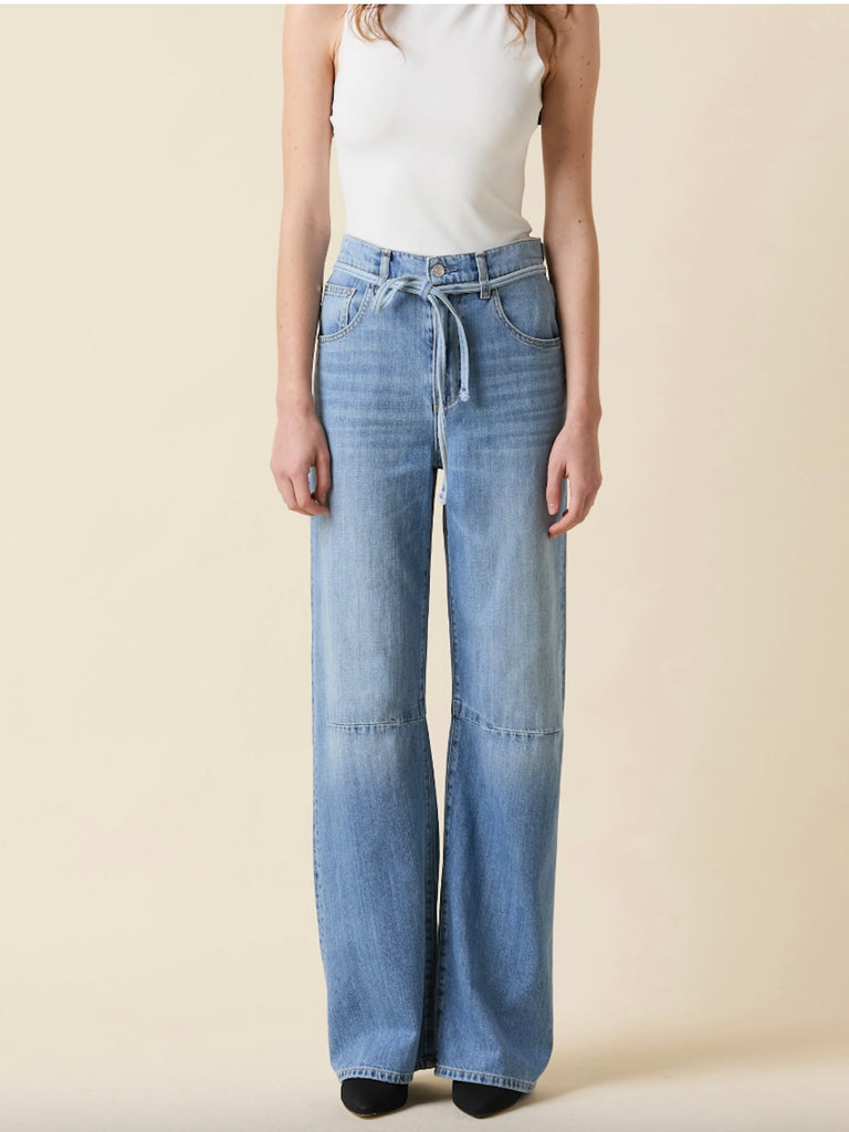 The Margot Soft Barrel Jean sits fitted at the waist with a softly curved outseam, flowing into a wide, straight leg that drapes effortlessly in lightweight, non-stretch denim. Finished in a light wash with an added waist tie, this piece delivers a standout look. Made in Los Angeles.
