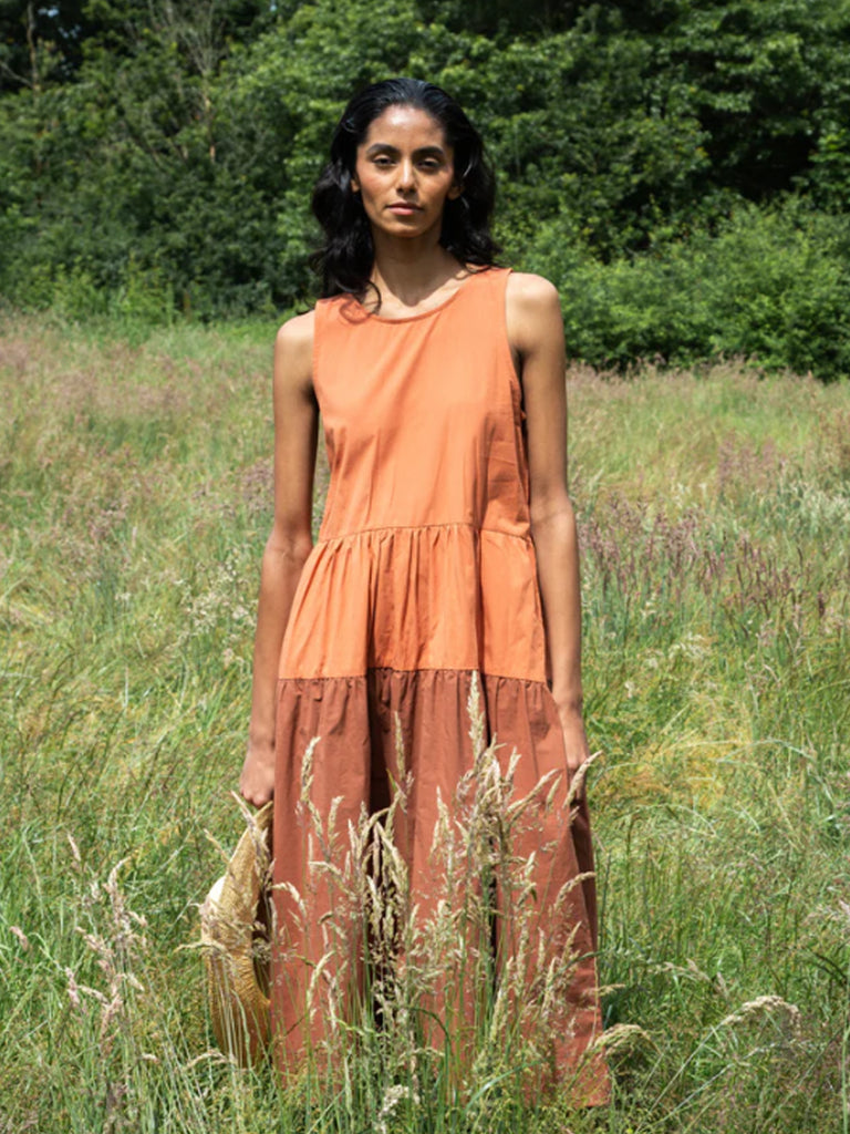 The Noelle dress is a sleeveless, tiered midi dress, with a loose cut A-line body. It features a low scoop back, with a tie to the back neck, and side pockets at the hip.