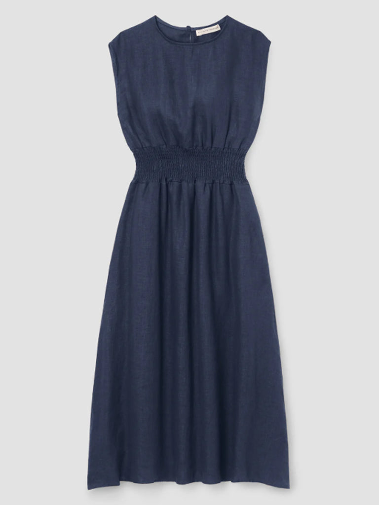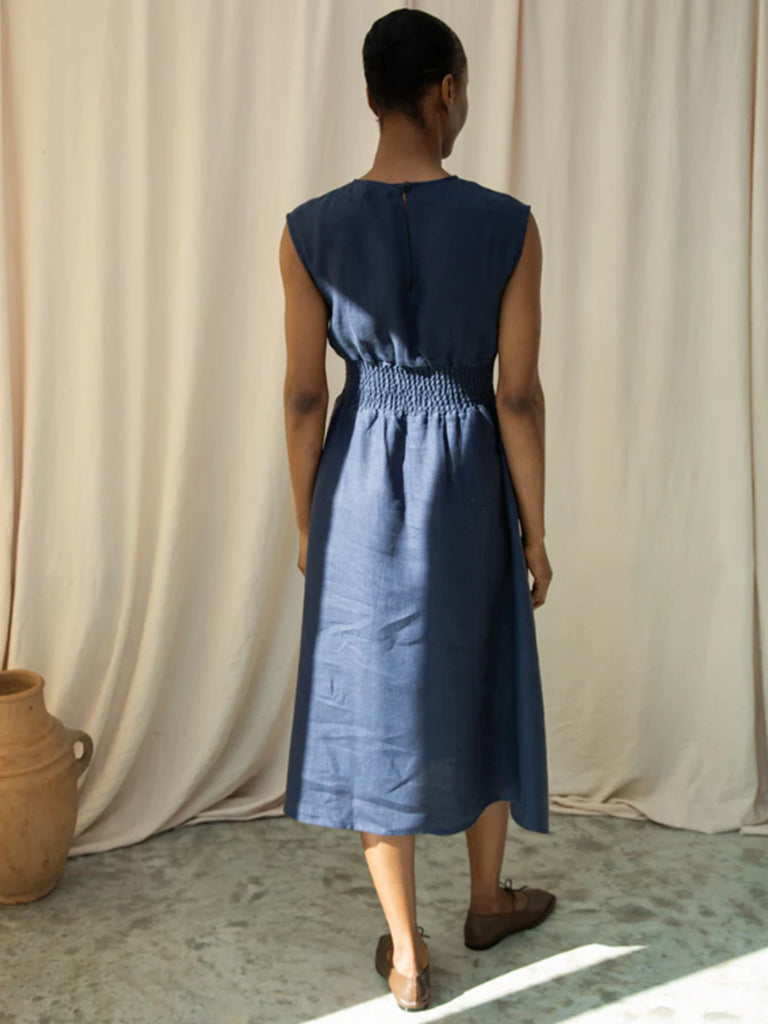 Crafted from luxurious linen, the Ottillie-May features boxy, sleeveless top which blouses into a shirred waistband, with an A-line skirt and pockets at side seam.