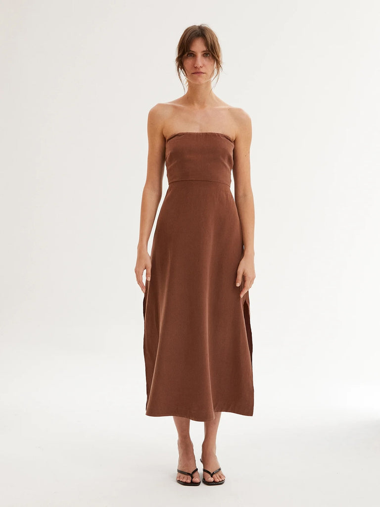 The Penelope dress is crafted from breathable cupro to a strapless silhouette with a bow in the back for an adjustable, personalised fit. Perfect for special occasions, a timeless and sophisticated addition to any summer wardrobe.