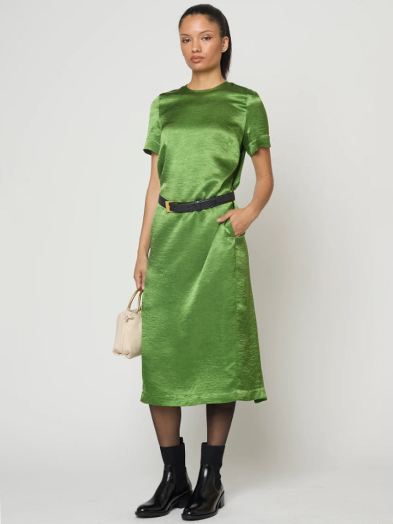 The Simone Dress is a short-sleeve, seasonless piece crafted from crinkled satin. With a boxy column silhouette, crewneck, and back zipper closure, it offers effortless, versatile styling from day to night.