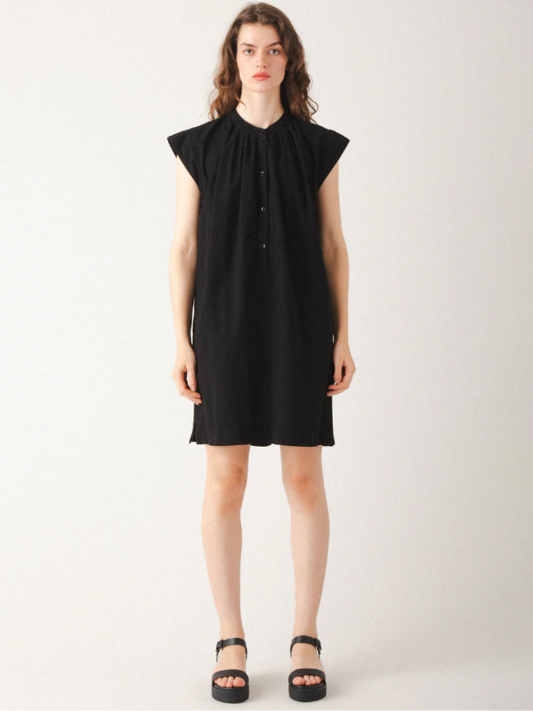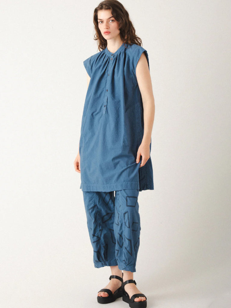 A modern shift dress with an architectural silhouette that feels as effortless as it looks. Crafted from our favorite textured organic cotton muslin, this piece gathers tiny pleats into a mandarin collar, creating a soft, poetic shape. Strong cap sleeve insets provide structure, balancing the romantic details with sharp design. Side slits and large side-seam pockets add ease and functionality, while the front button placket offers versatile styling—wear it open for layering, or buttoned up for a doll-like effect. Pair with the Gathering Pant for a complete, standout look.