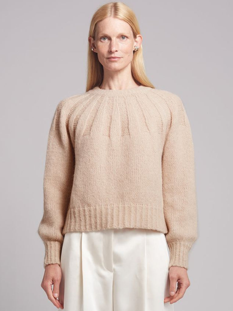 Mila is a relaxed fashion-staple sweater to pop-on-and-go with a feminine blouson-sleeve, a circular ribbed yoke and a slightly cropped body-proportion, you can pair her with high-waisted pants perfectly, making you feel both refined, yet relaxed.