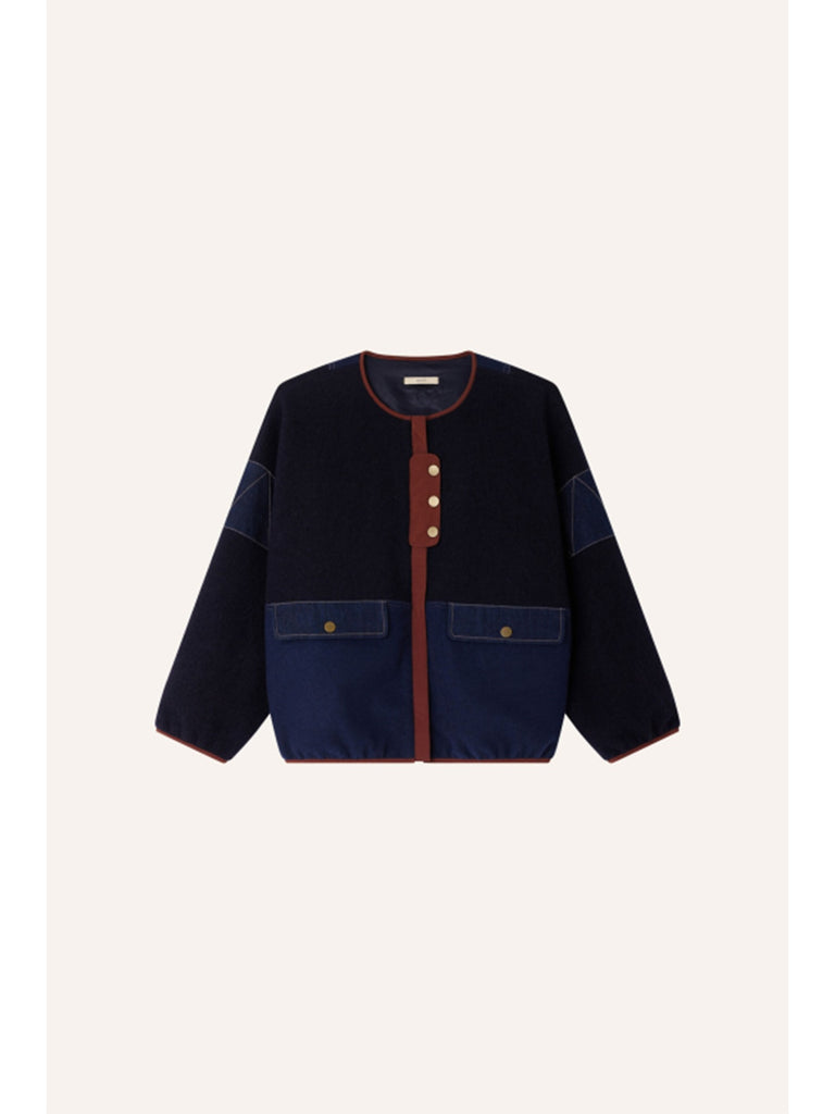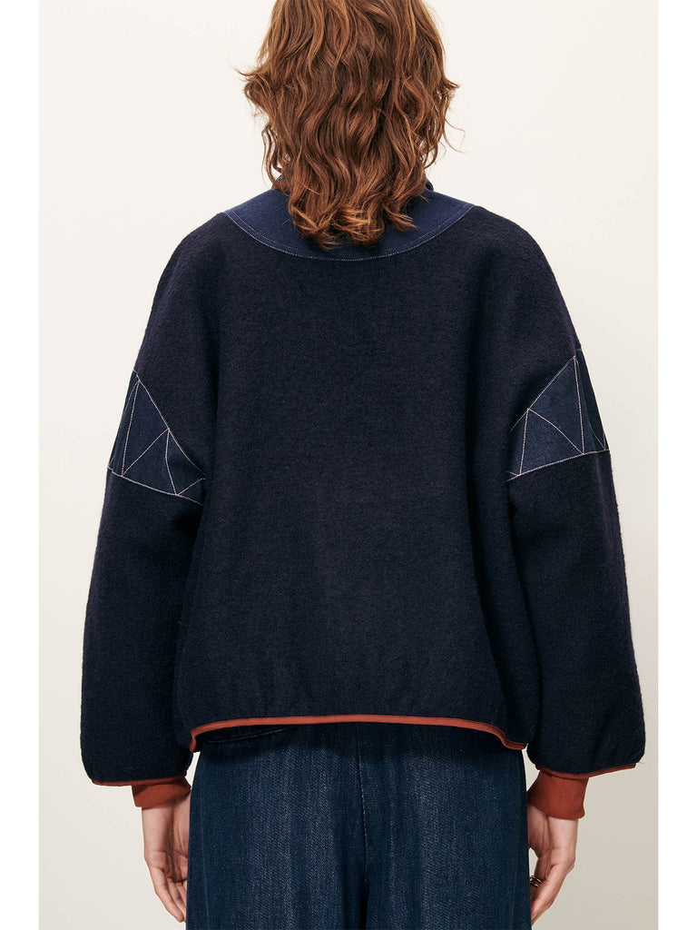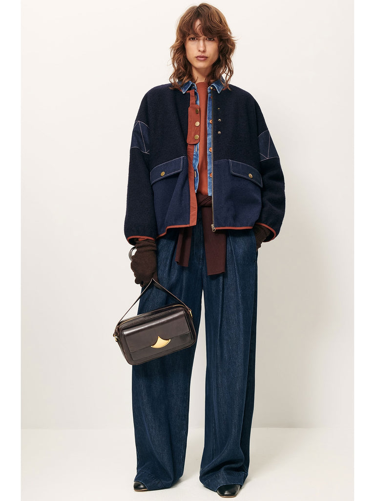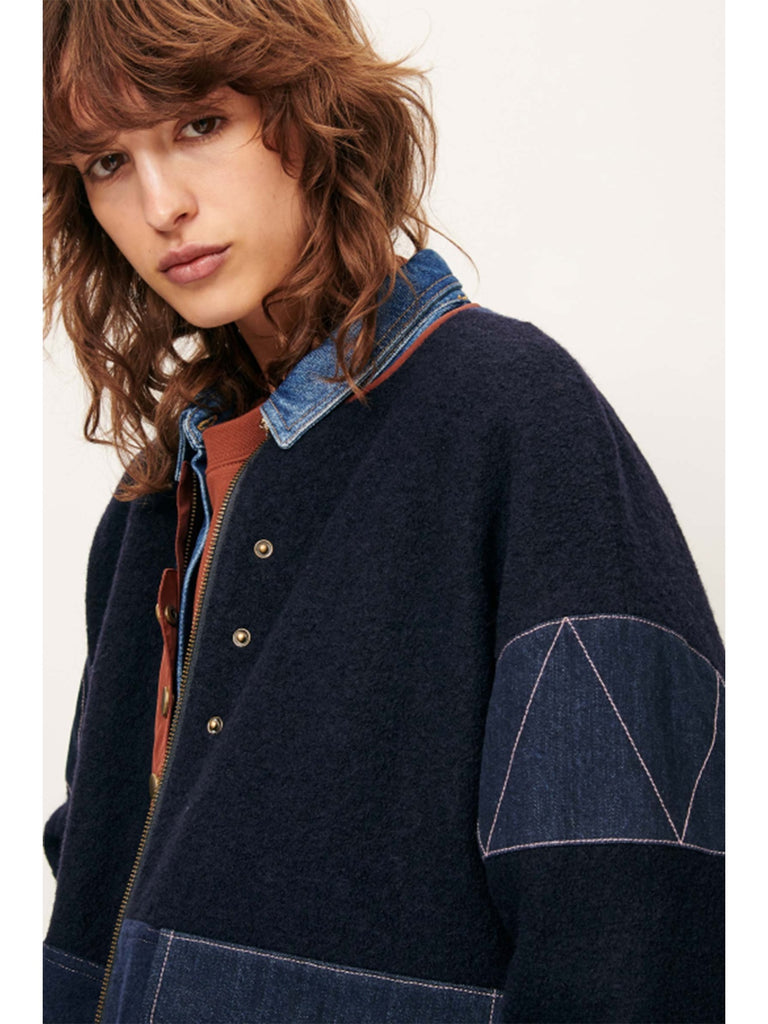 Round jacket in boiled wool. Denim yokes and contrasted topstitching. Snap-tab detail and contrasted bias nylon finishes. 100% RWS certified Wool