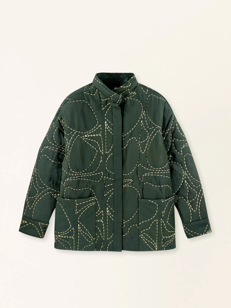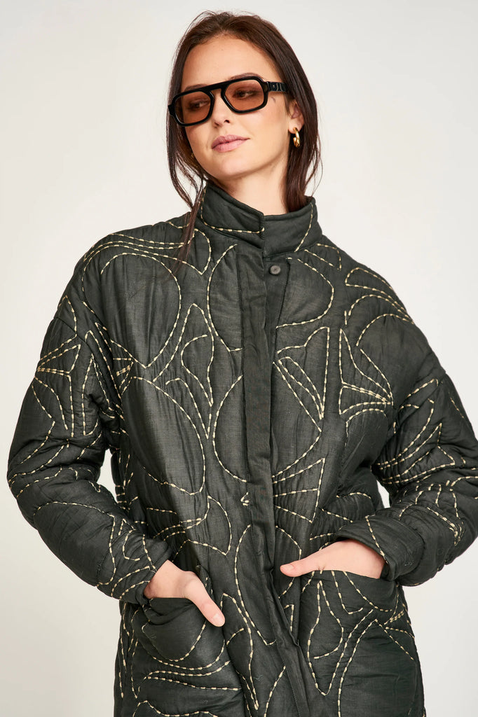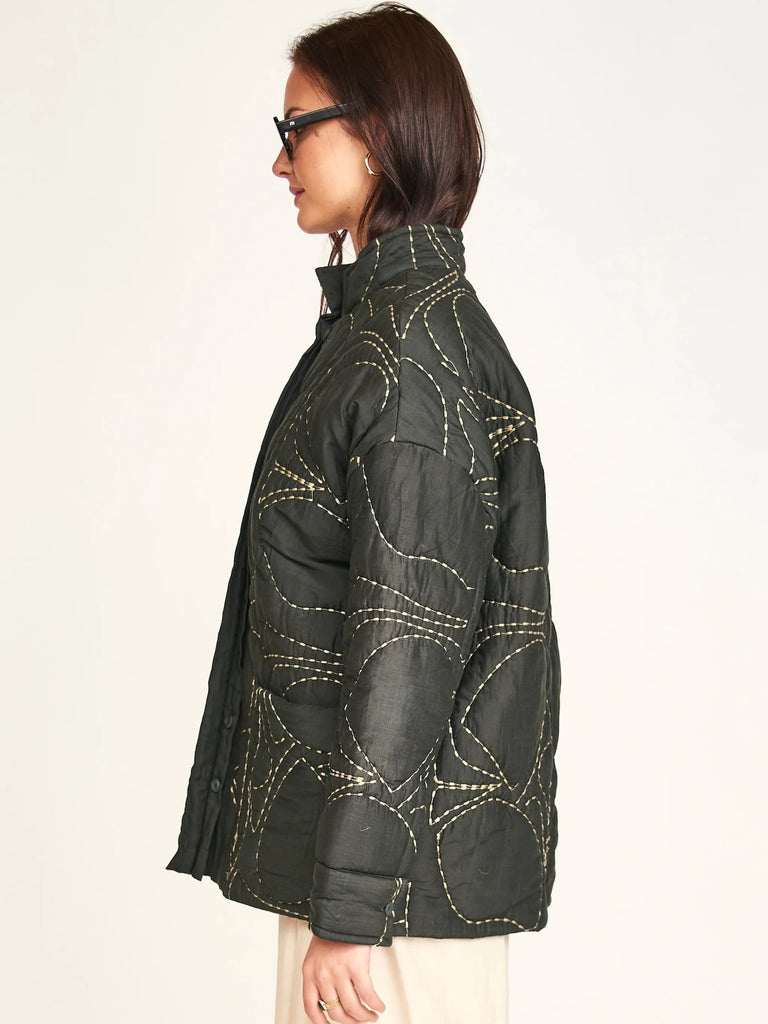 Oversized quilted jacket with contrast running stitch detail in an abstract motif. Cotton/silk blend. Made in India.