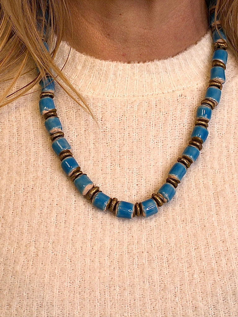 Handcrafted ceramic beads secured with a vintage brass clasp. Beads handmade by women in Ukraine. A weighty and sustainable necklace perfect for daily wear, suitable for breaking up layered chains. Hand strung in NYC.