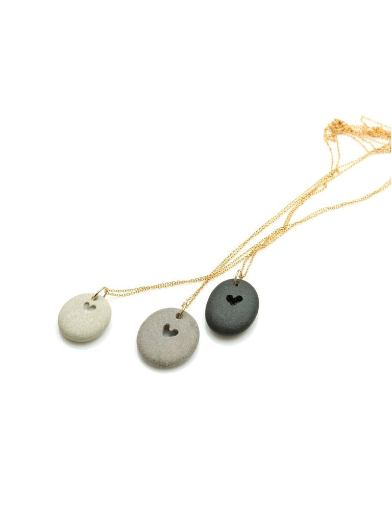 One-of-a-kind beach stone necklace with heart silhouette cutouts. Available in tan, black, and grey. Strung on 14k gold-filled chain.
