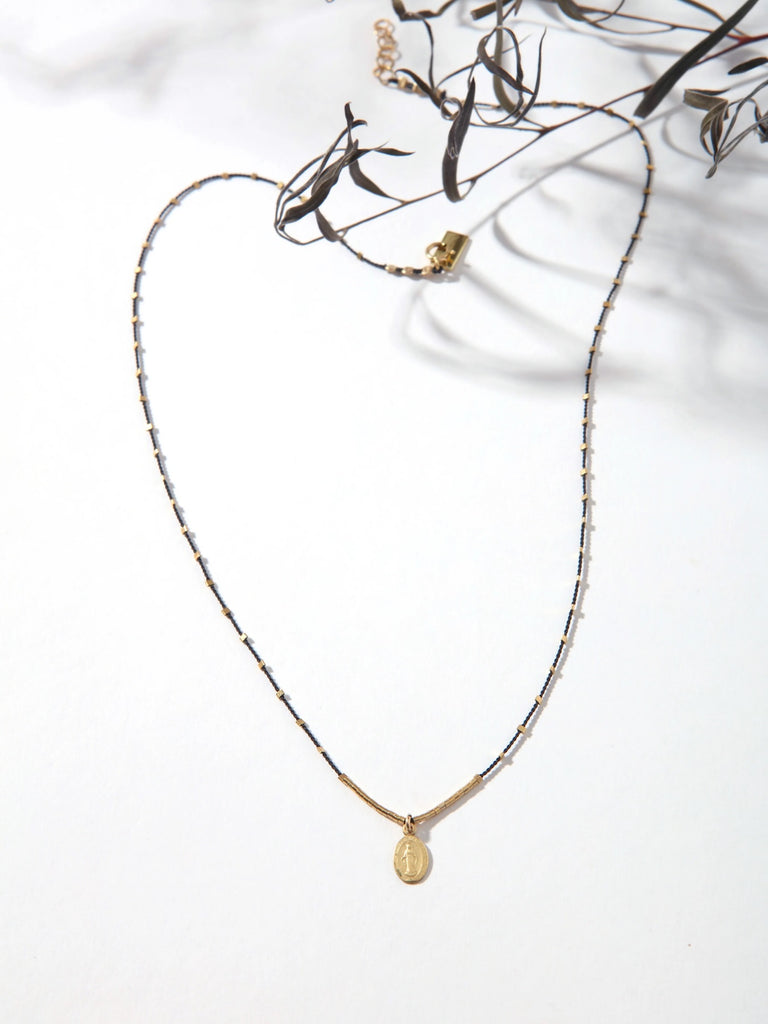 Brass Mary charm on silk with gold filled beads. Length: 17" plus extension.
