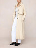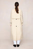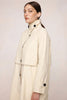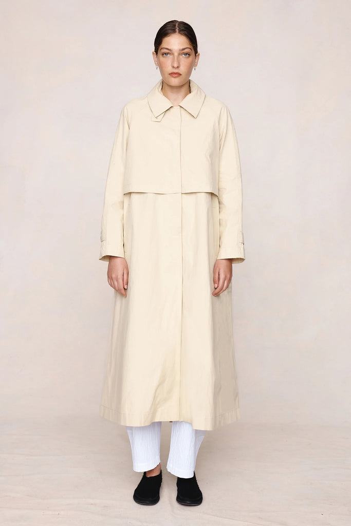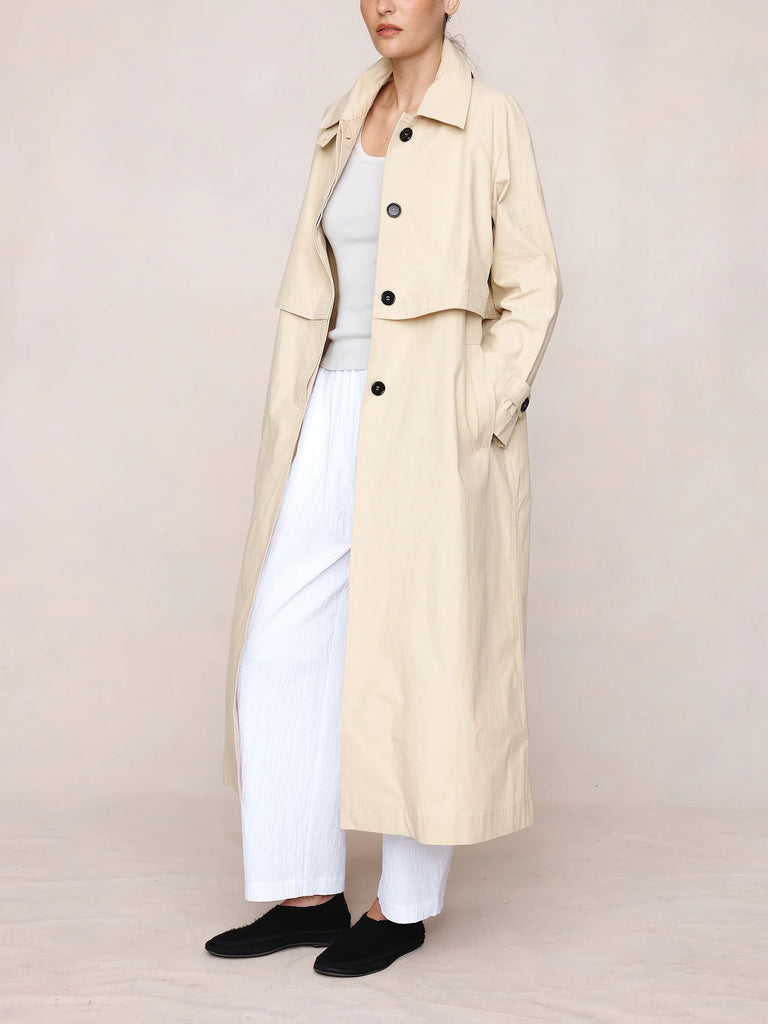 Longline trench coat in a crisp 100% cotton with a relaxed, elongated shape, high stand collar with adjustable button fastening, concealed front placket, raglan sleeves with adjustable cuff tabs, back storm flap, and a single back vent.