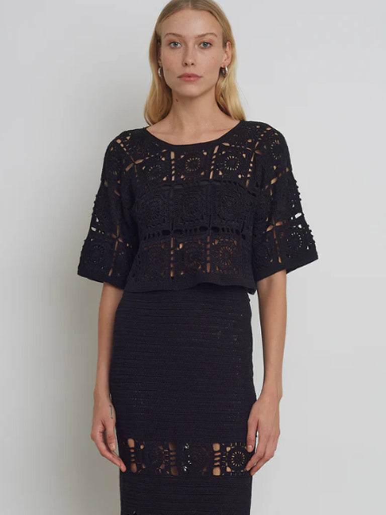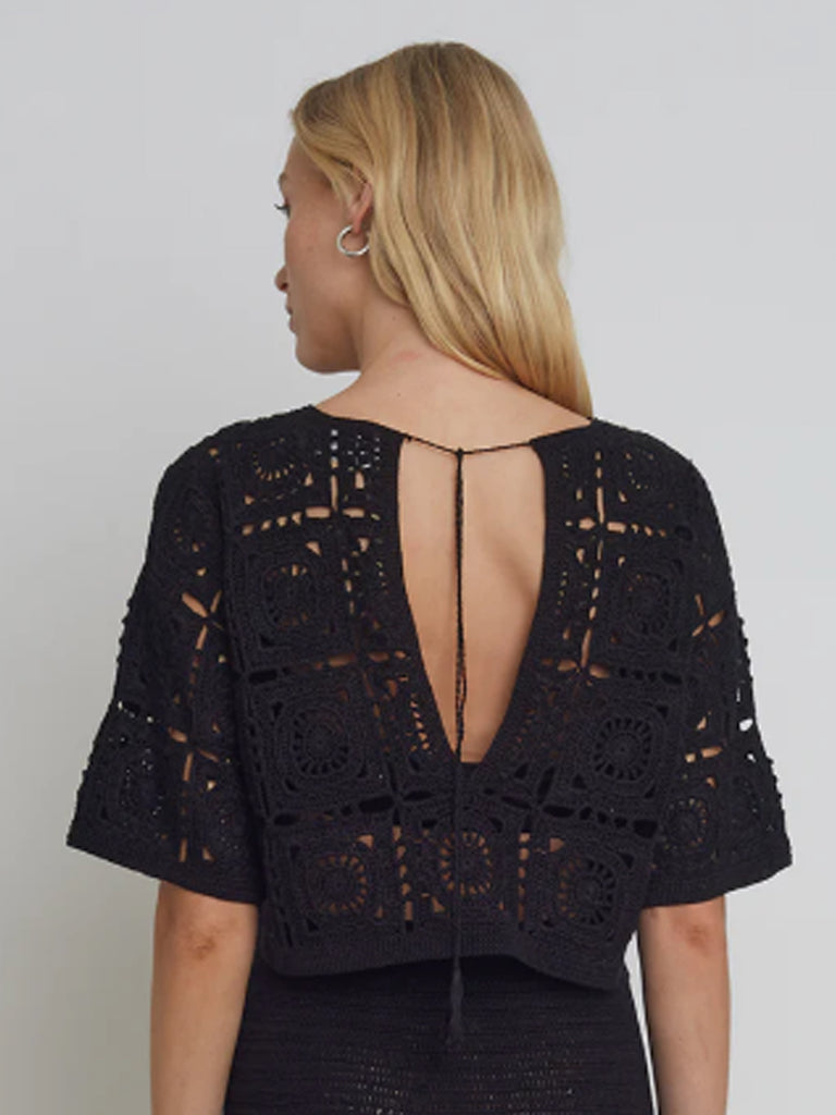 The Arden Crochet Top reimagines the classic T-shirt silhouette with a subtly boxy cut and a bold, hand-crocheted texture in a timeless “grandma squares” stitch. Finished with a braided back-neck tie and keyhole detail, it balances craftsmanship with modern ease. Style Arden with the matching Jana Crochet Skirt for a considered set, or pair it with your favorite high-waist trousers for an elevated everyday look.