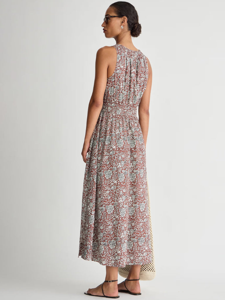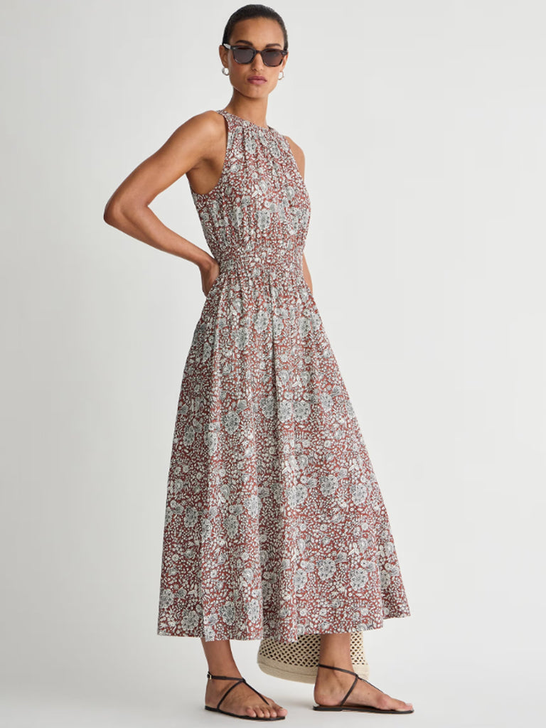 - Elastic at neckline and waist, fitted at the bodice, slits at both sides of skirt, side pockets