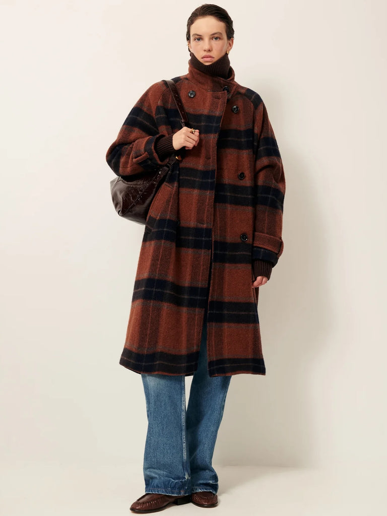Long double-breasted coat with a high collar in double twill wool with tartan checks, brushed on the right side, woven in Italy.