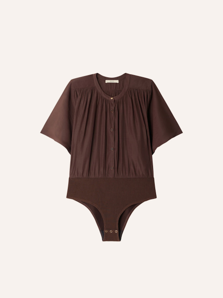 Short sleeves button-up bodysuit in slightly creponed fluid satin and ribbed jersey panty. 100% GRS certified Recycled Polyester.