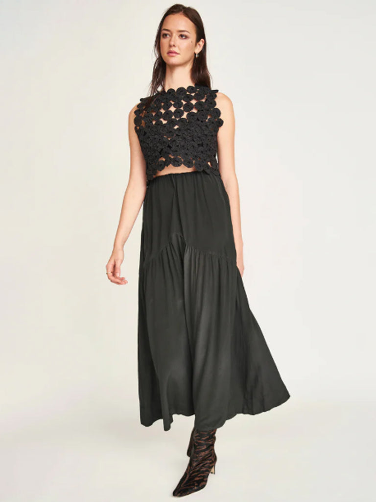 - Softly gathered long, tiered skirt