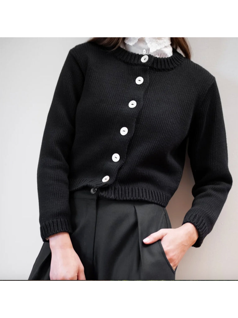 An essential year-round style in a chunky organic cotton yarn. Opens at the front with seashell buttons. A slightly cropped length.