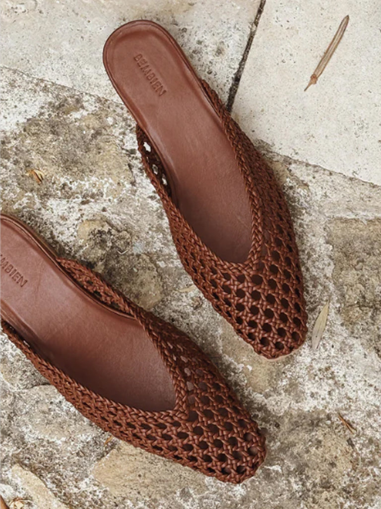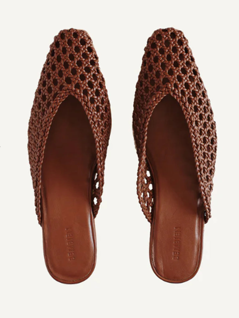A pointed, square toe mule with a v-cut shape that visually elongates the leg. Handcrafted in our open net weave leather. It features a petite stacked heel to give you a little extra height and a padded insole for all-day comfort.