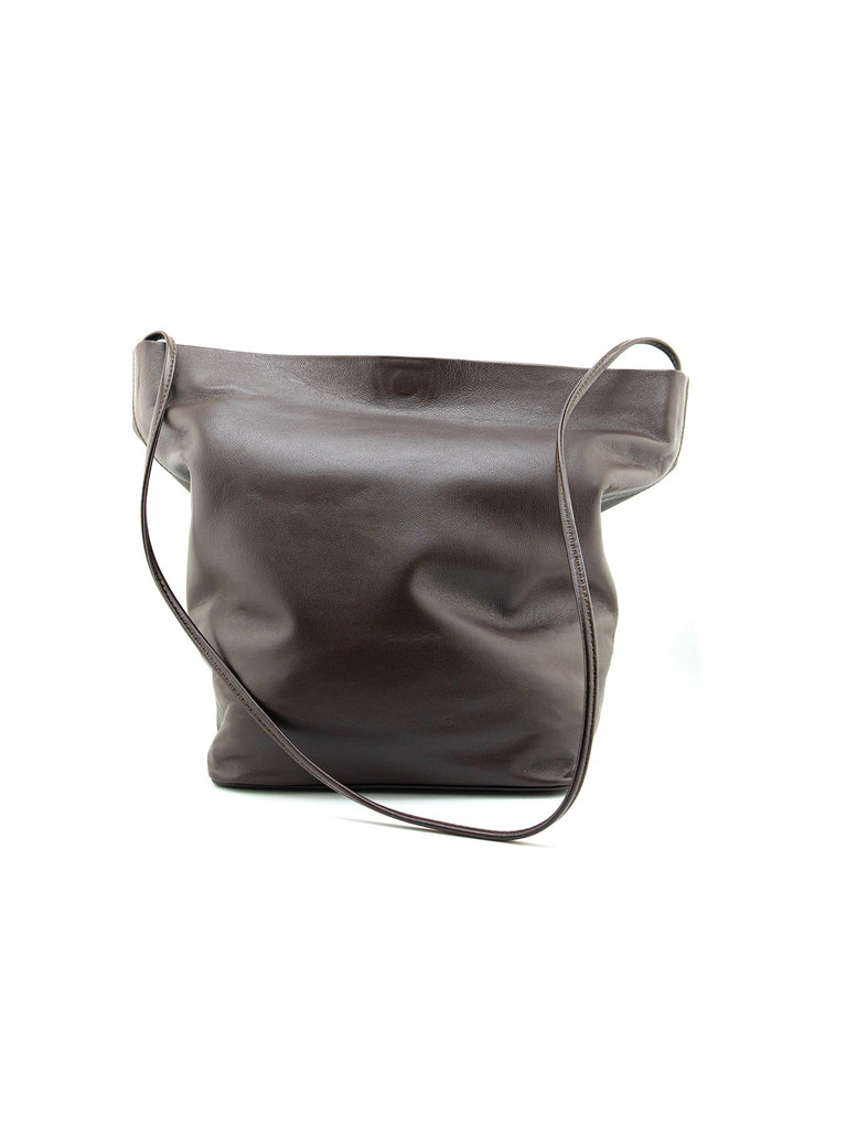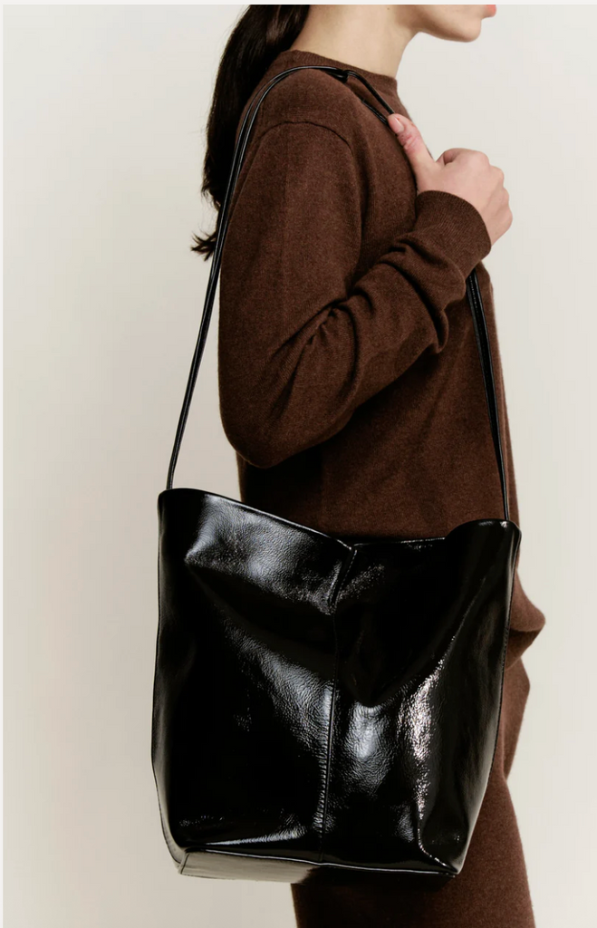 More room for all your valuables with a long single strap to wear as a cross body - or knot at the top for a shoulder bag. Versatile for everyday needs. Glossed Leather with double looped straps to create one single strap.