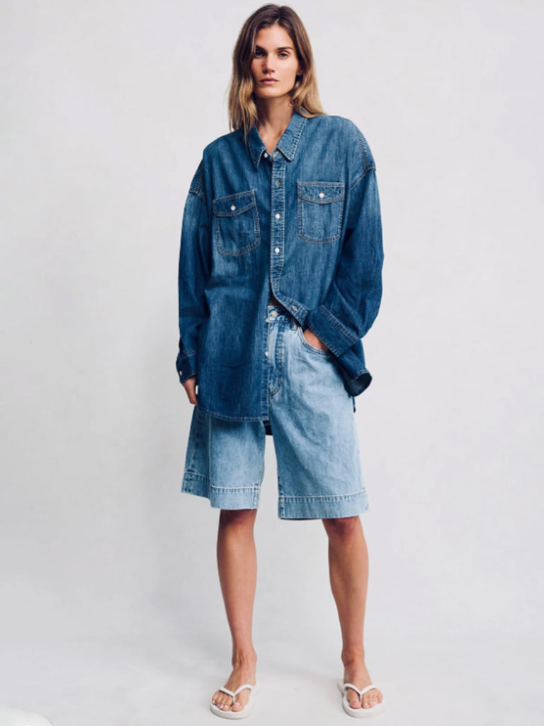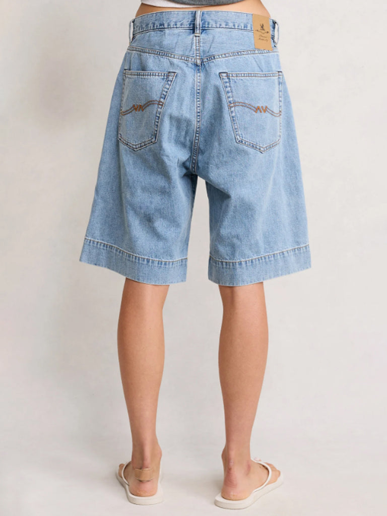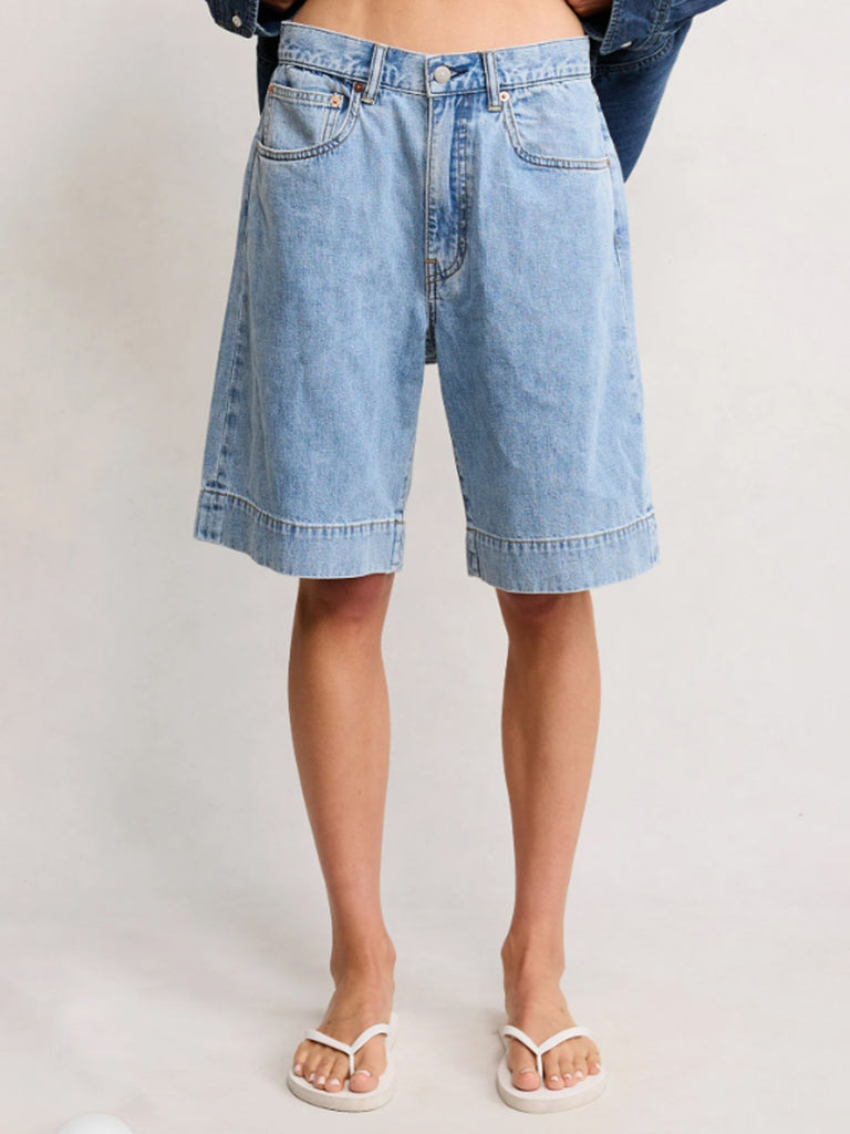 Relaxed knee length short built with rigid denim and a light stone washed finish.