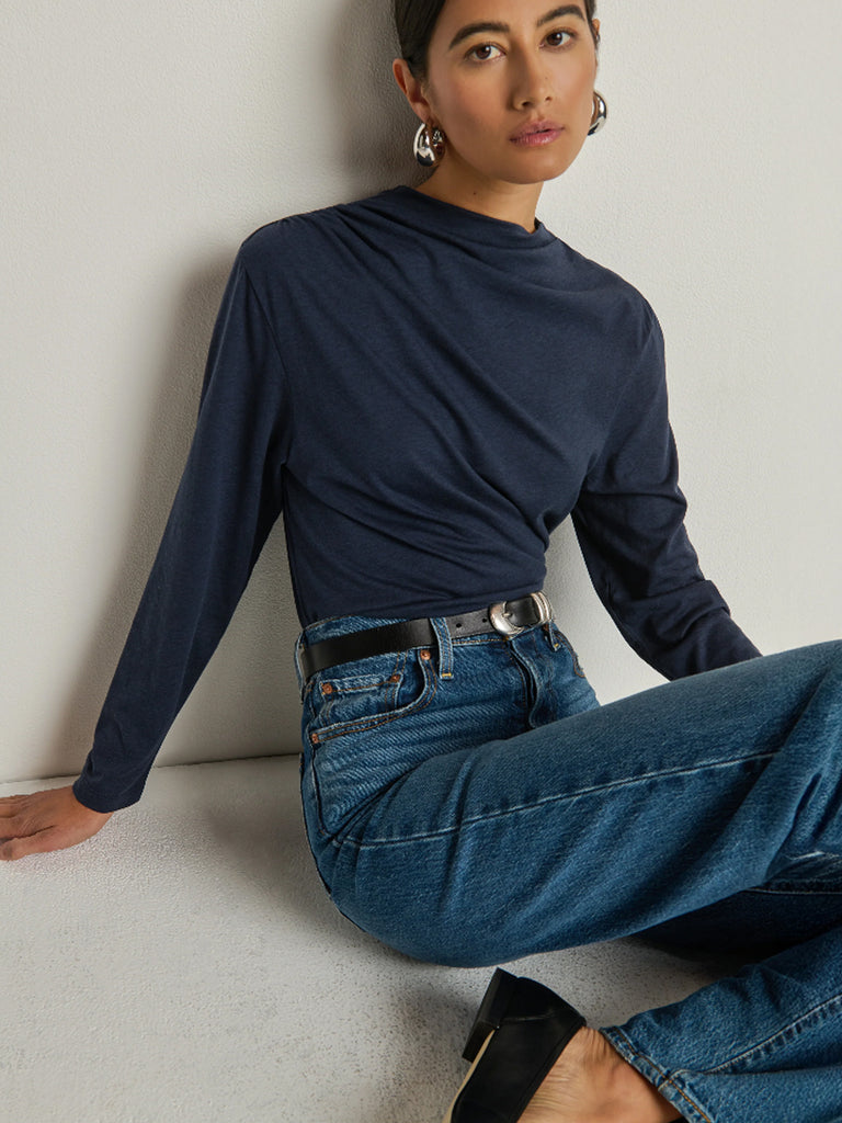 Whether you’re staying in or constantly on the move, the Kristen Tee keeps up. Made from luxe jersey with soft shirring, this polished staple drapes just right in our classic signature fit. A mock neck and long sleeves mean you’ll be reaching for this piece all the time. 50% pima cotton, 50% tencel lyocell. Made in Peru.