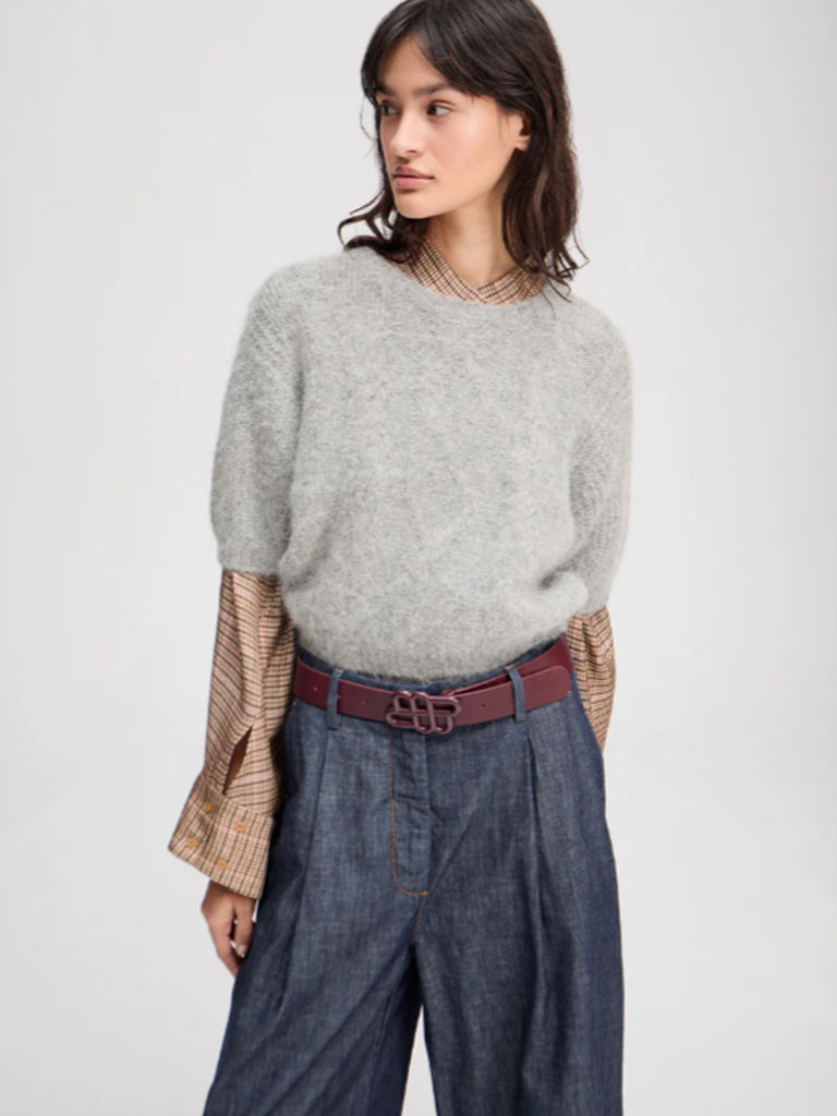 A short, beautiful cable knit designed with delicate ribbed edges and a round neckline.