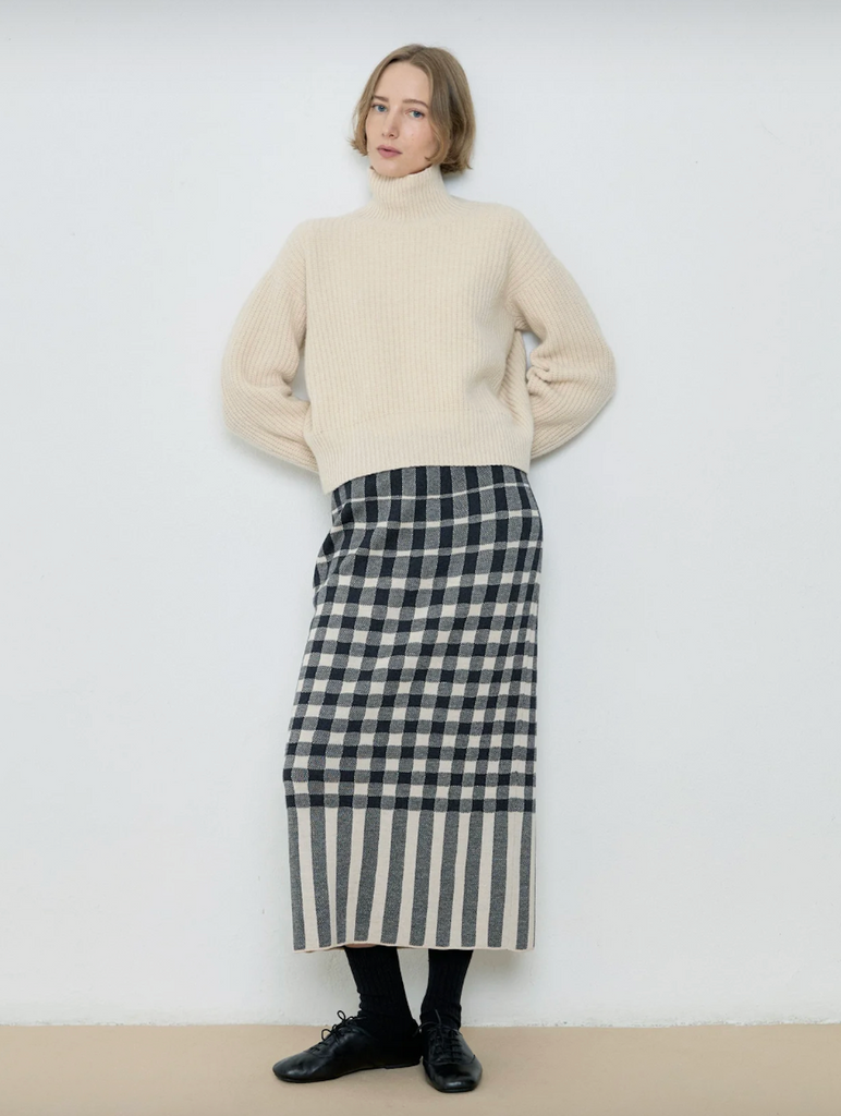 Turtleneck sweater knitted in soft Cashmere and Merino wool blend yarn. Slightly cropped, this relaxed-fit sweater features a fisherman's rib texture and intentional stitch increases on the sleeves. 10% Cashmere 90% Merino. Made in Spain in a local and family-run factory. Hand wash only. Do not tumble dry. Do not bleach. Iron in low temperature. Can be drycleaned.