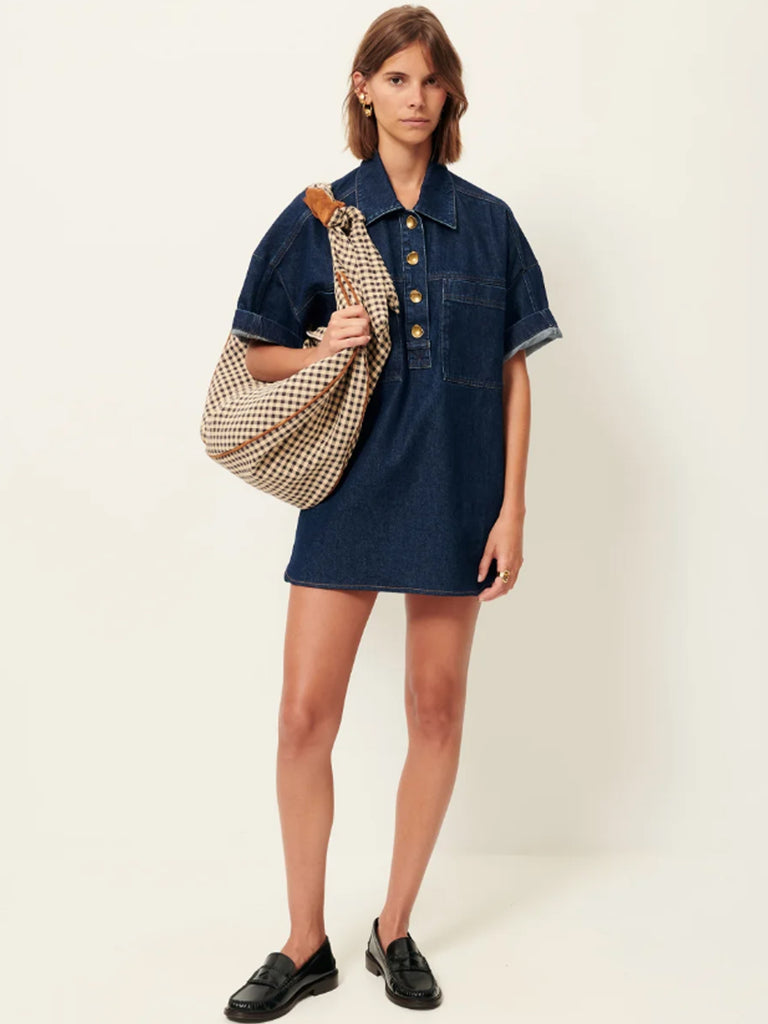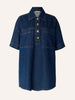 Short polo dress with patch pockets in heavy stonewashed indigo denim.