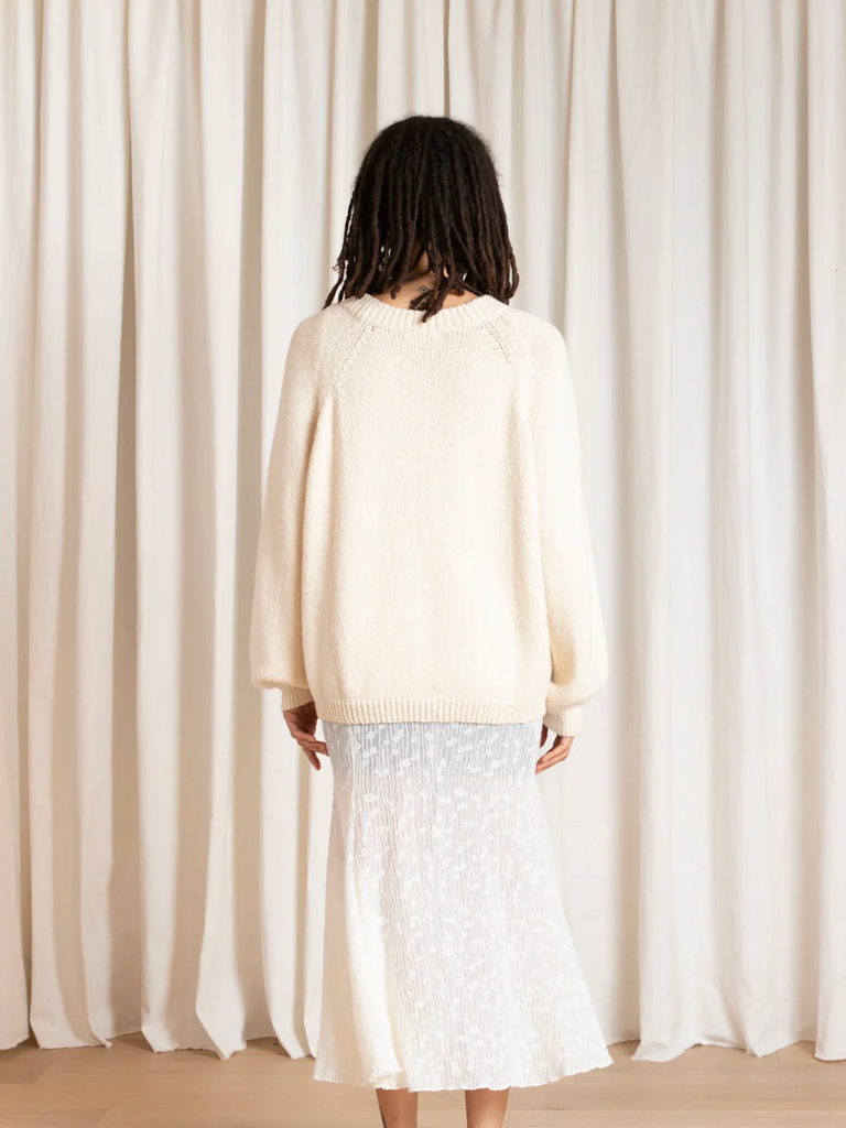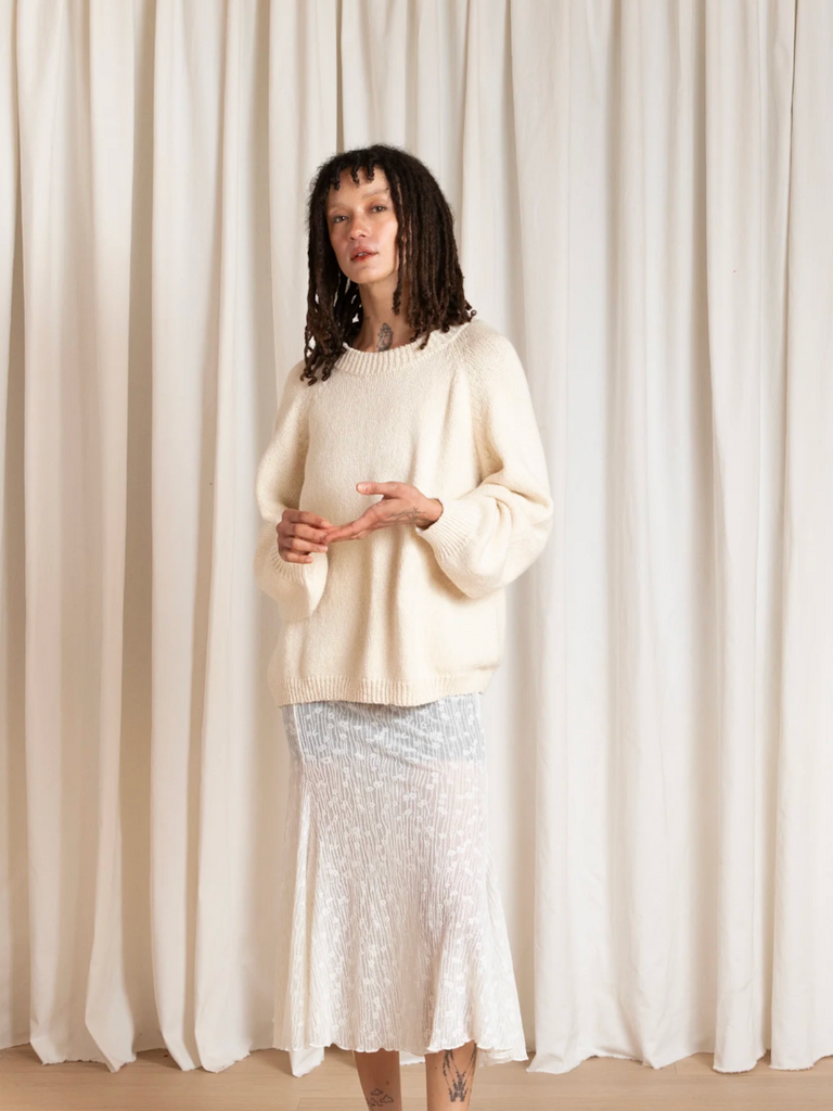 Classic jersey stitch crew neck pullover with slight bell sleeves in the softest Baby Alpaca/Organic Pima cotton yarn. Made with love at an ethically sound, women-owned factory in Peru.