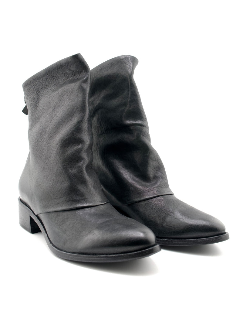 Ankle boots crafted from 100% Italian leather. lleather Back zipper. Slight western profile with pointed toe. Flat leather/rubber sole. Made in Italy.