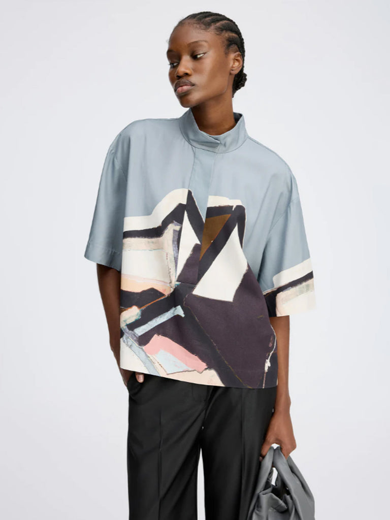 A beautiful shirt blouse with an elegant art print. It is designed with short sleeves, can be opened halfway down, and features a small collar with a fine button closure detail. The blouse has a loose fit.