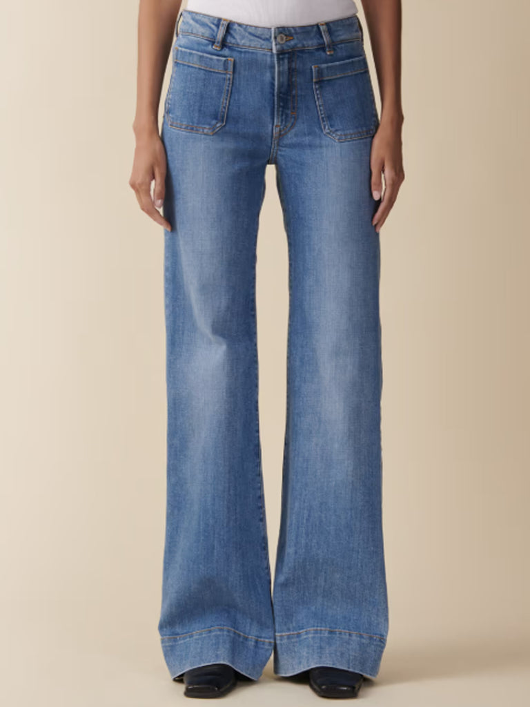 The St. Monica Low is a low-rise version of Jeanerica’s iconic fit, inspired by sailor styles of the late 1960s. Featuring patch pockets, flared legs, and a wide hemline, this style balances vintage influence with a modern silhouette.