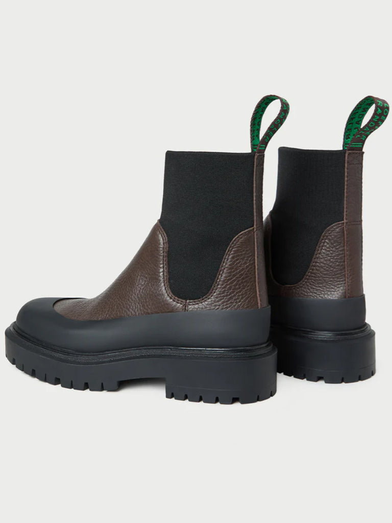 Lug sole weather boot in brown pebble leather. Features a rubber outsole, almond toe, and stretch gore ankle. Pulls on. 0.5-inch heel.