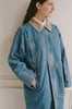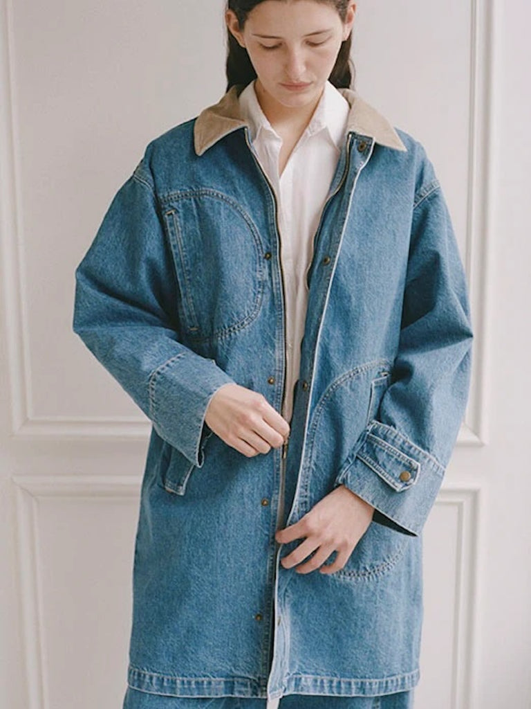 A long duster utility coat in Italian Denim with chest and waist pocket details at front, zipper and snap closure entry, contrast corduroy collar and longer length. This is a roomy fit coat, perfect for layering knits under. A hardworking piece for all season wear.