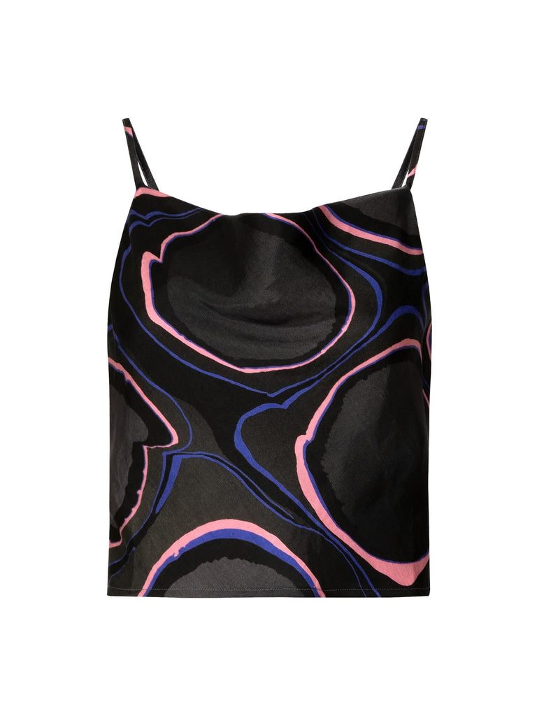 The Amman top is a body-skimming crop tank with an elegant cowl neckline, and adjustable straps. Featuring UIM custom abstract artwork Obsidian, this easy top pairs perfectly with denim or the Lelaki skirt as a set.