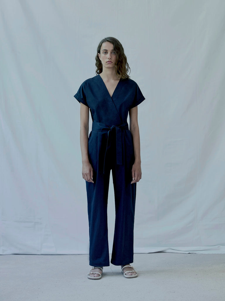 Effortless wrap jumpsuit with deep frontal pleats in cotton-linen twill from Spain. Features side seam pockets, a zipped back and a belt made from the same fabric.