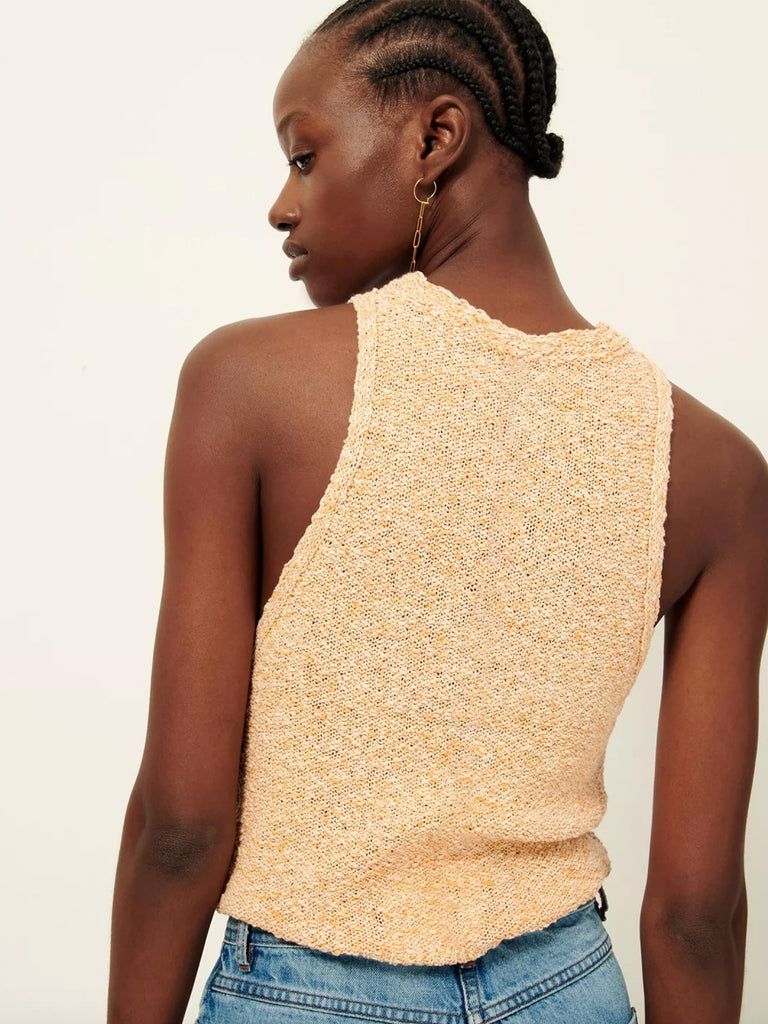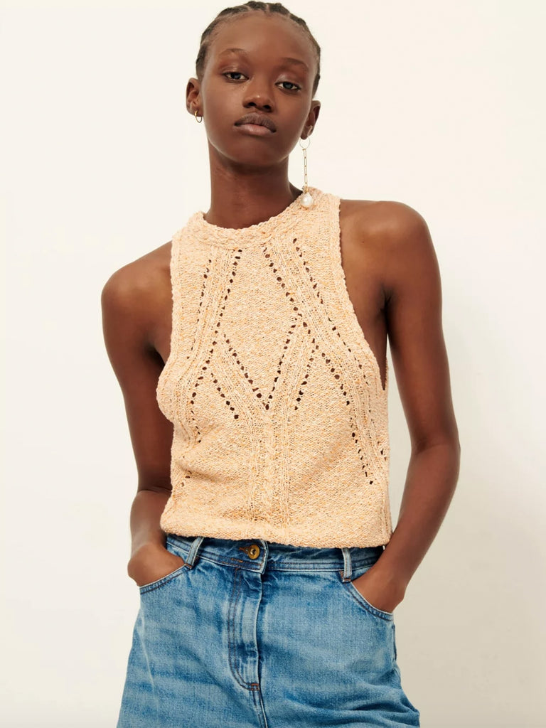 Tank top with an American-style neckline in reverse stocking stitch knit with rib and cabling details, knitted in Italy.